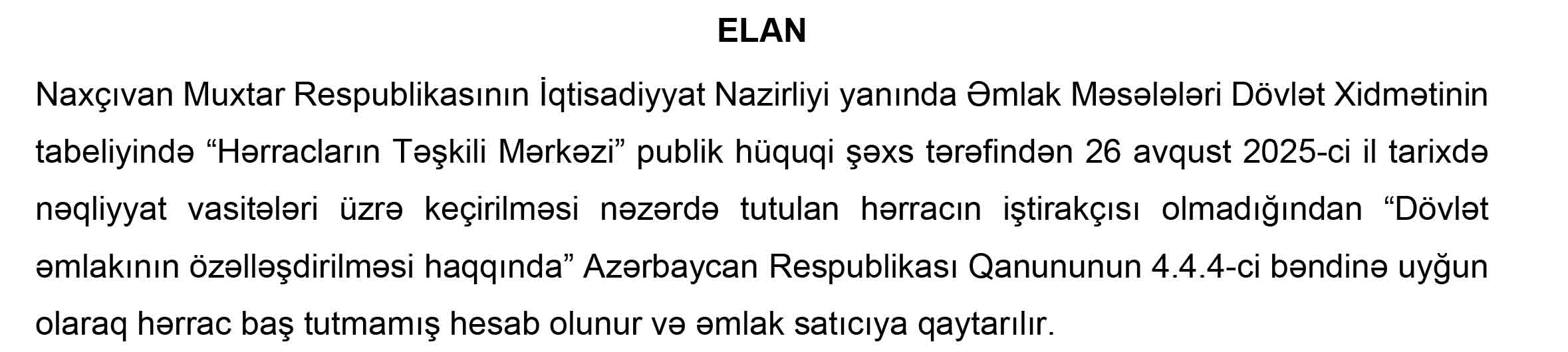 26 avqust 2025-ci il tarixdə nəqliyyat vasitələri üzrə keçirilməsi nəzərdə tutulan hərracın baş tutmaması haqqında məlumat