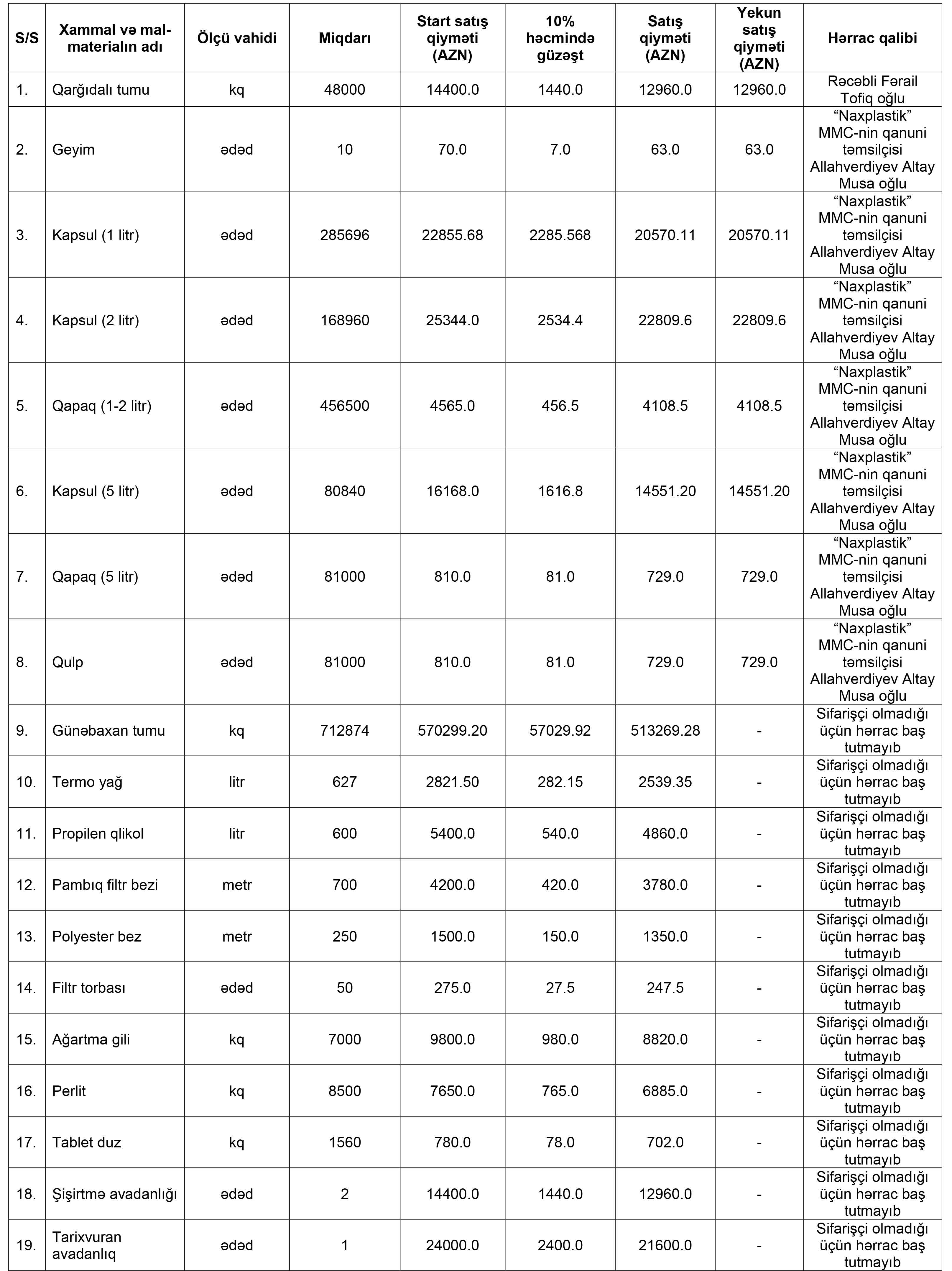 Naxçıvan MR İqtisadiyyat Nazirliyi yanında Əmlak Məsələləri Dövlət Xidmətinin tabeliyində “Hərracların Təşkili Mərkəzi” publik hüquqi şəxs tərəfindən 01 aprel 2025-ci il tarixdə keçirilən xammal və mal-materialların satışı üzrə hərracın nəticələri
