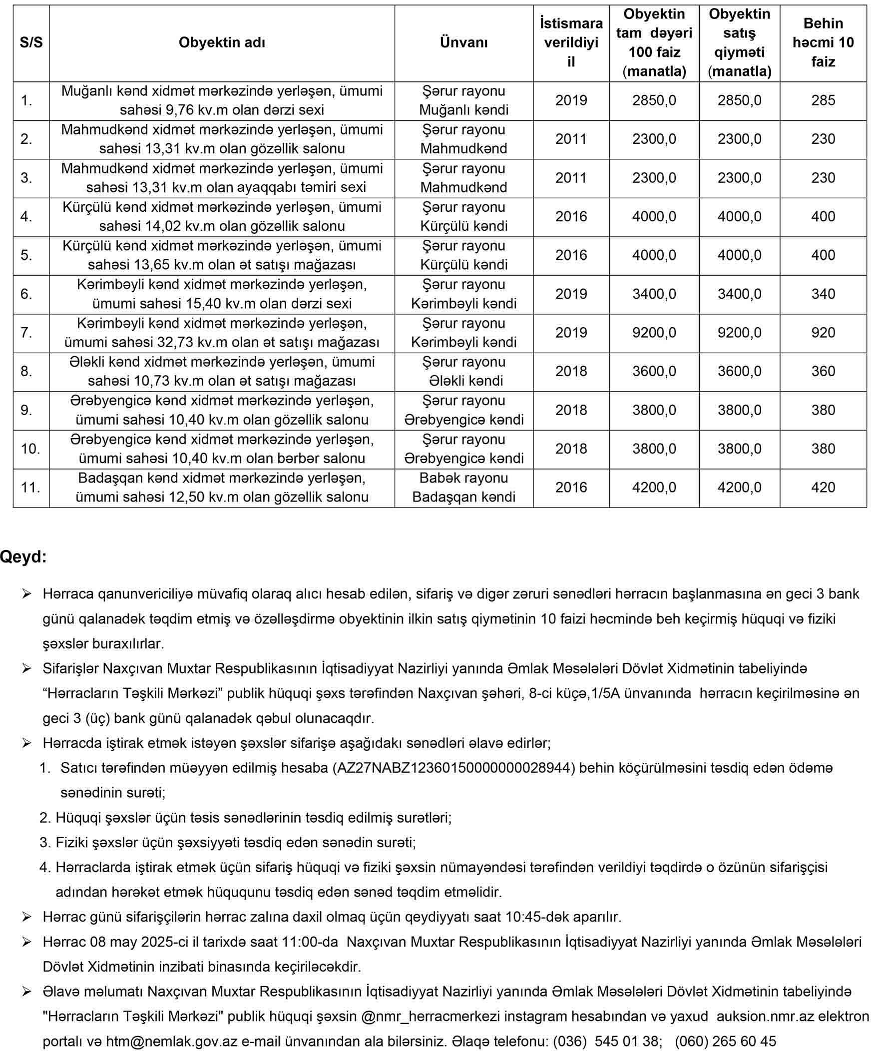 Naxçıvan MR İqtisadiyyat Nazirliyi yanında Əmlak Məsələləri Dövlət Xidmətinin tabeliyində “Hərracların Təşkili Mərkəzi” publik hüquqi şəxs tərəfindən 08 may 2025-ci il tarixdə hərraca çıxarılacaq qeyri-yaşayış sahələri barədə məlumat