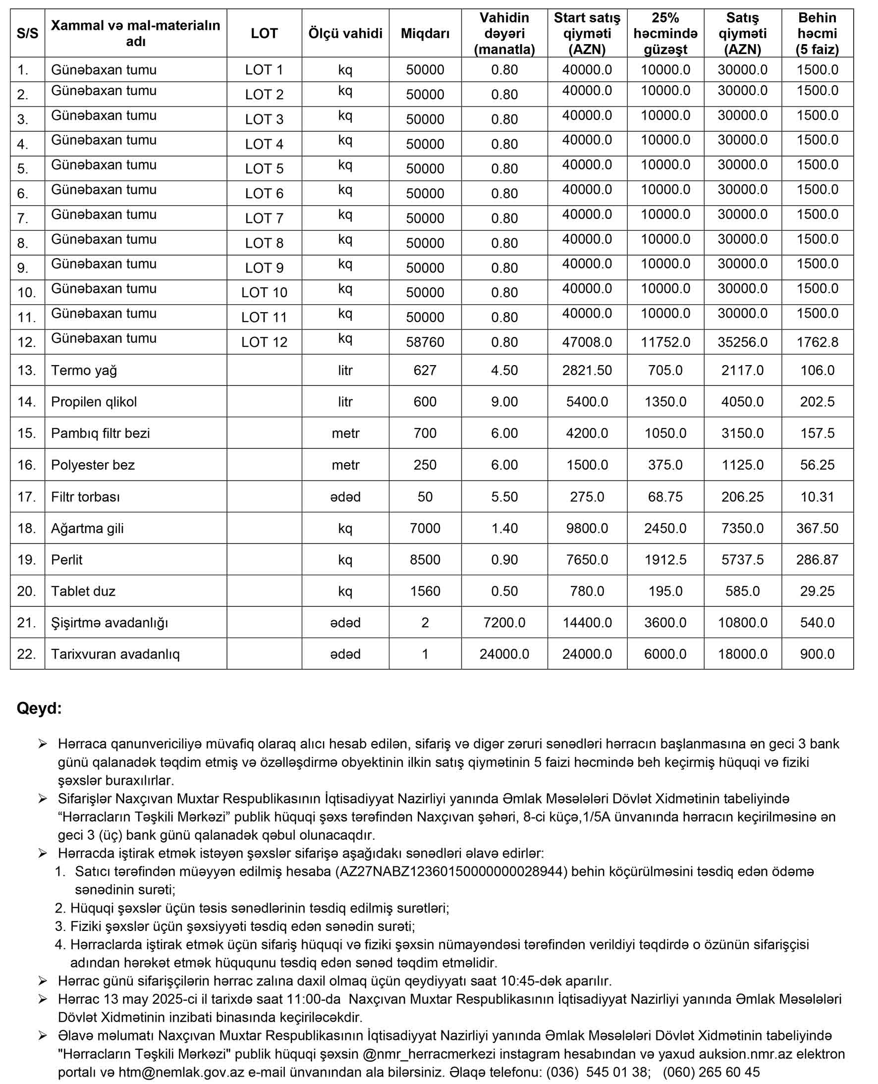 Naxçıvan MR İqtisadiyyat Nazirliyi yanında Əmlak Məsələləri Dövlət Xidmətinin tabeliyində “Hərracların Təşkili Mərkəzi” publik hüquqi şəxs tərəfindən 13 may 2025-ci il tarixdə dördüncü hərraca çıxarılacaq xammal və mal-materiallar barədə məlumat