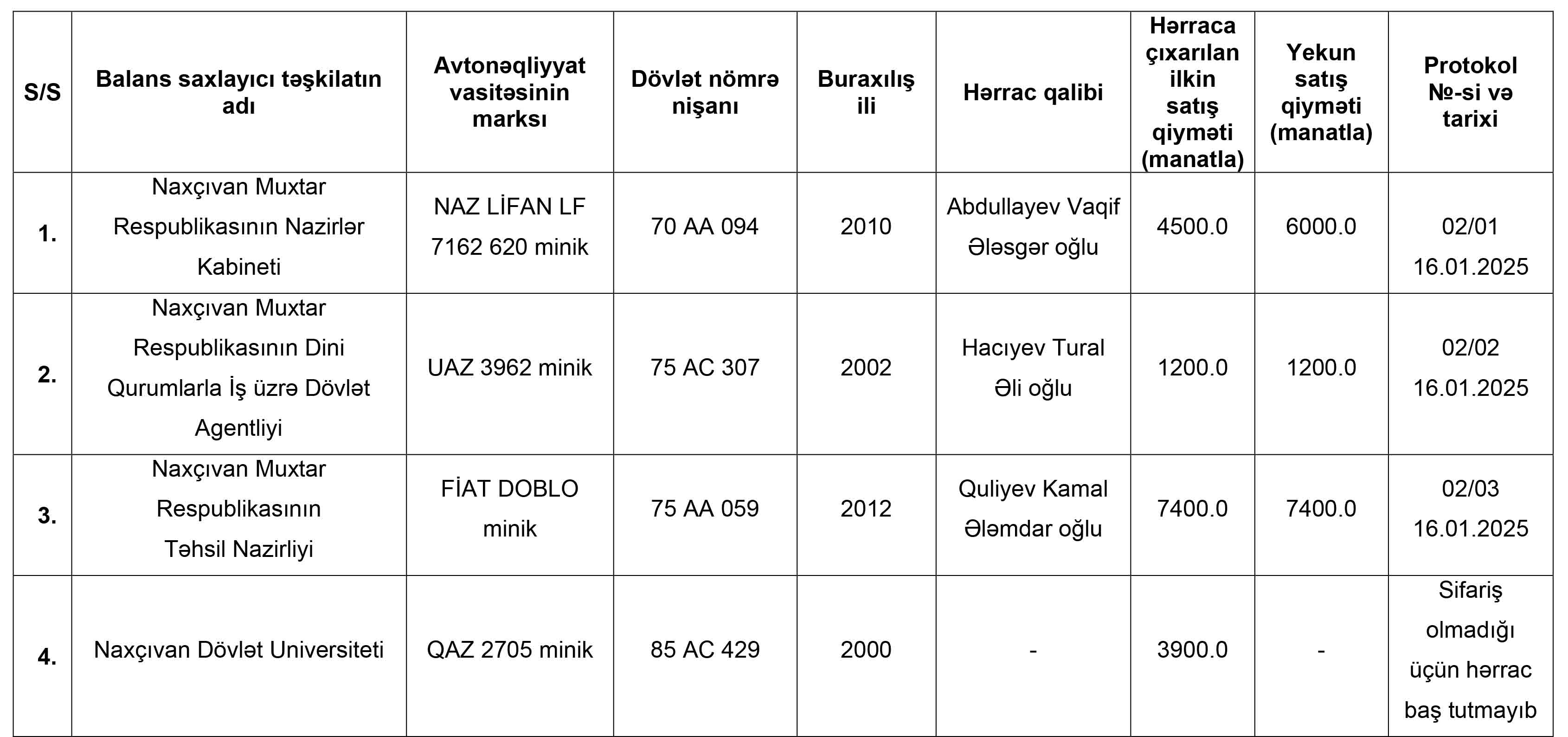 Naxçıvan MR İqtisadiyyat Nazirliyi yanında Əmlak Məsələləri Dövlət Xidmətinin tabeliyində “Hərracların Təşkili Mərkəzi” publik hüquqi şəxs tərəfindən 16 yanvar 2025-ci il tarixdə keçirilmiş nəqliyyat vasitələri ilə bağlı hərracın nəticəsi