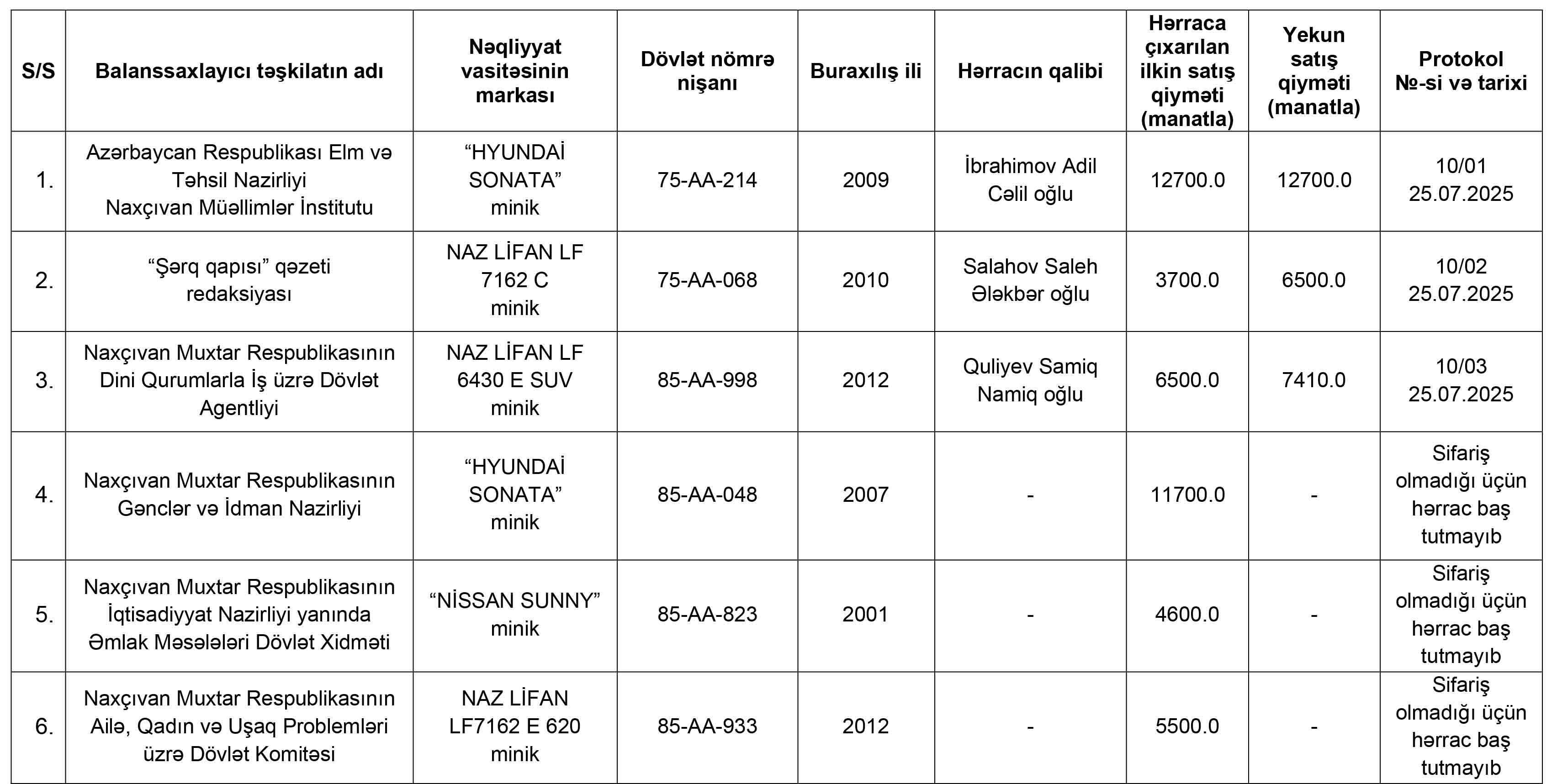 Naxçıvan MR İqtisadiyyat Nazirliyi yanında Əmlak Məsələləri Dövlət Xidmətinin tabeliyində “Hərracların Təşkili Mərkəzi” publik hüquqi şəxs tərəfindən 25 iyul 2025-ci il tarixdə keçirilmiş nəqliyyat vasitələri ilə bağlı hərracın nəticələri