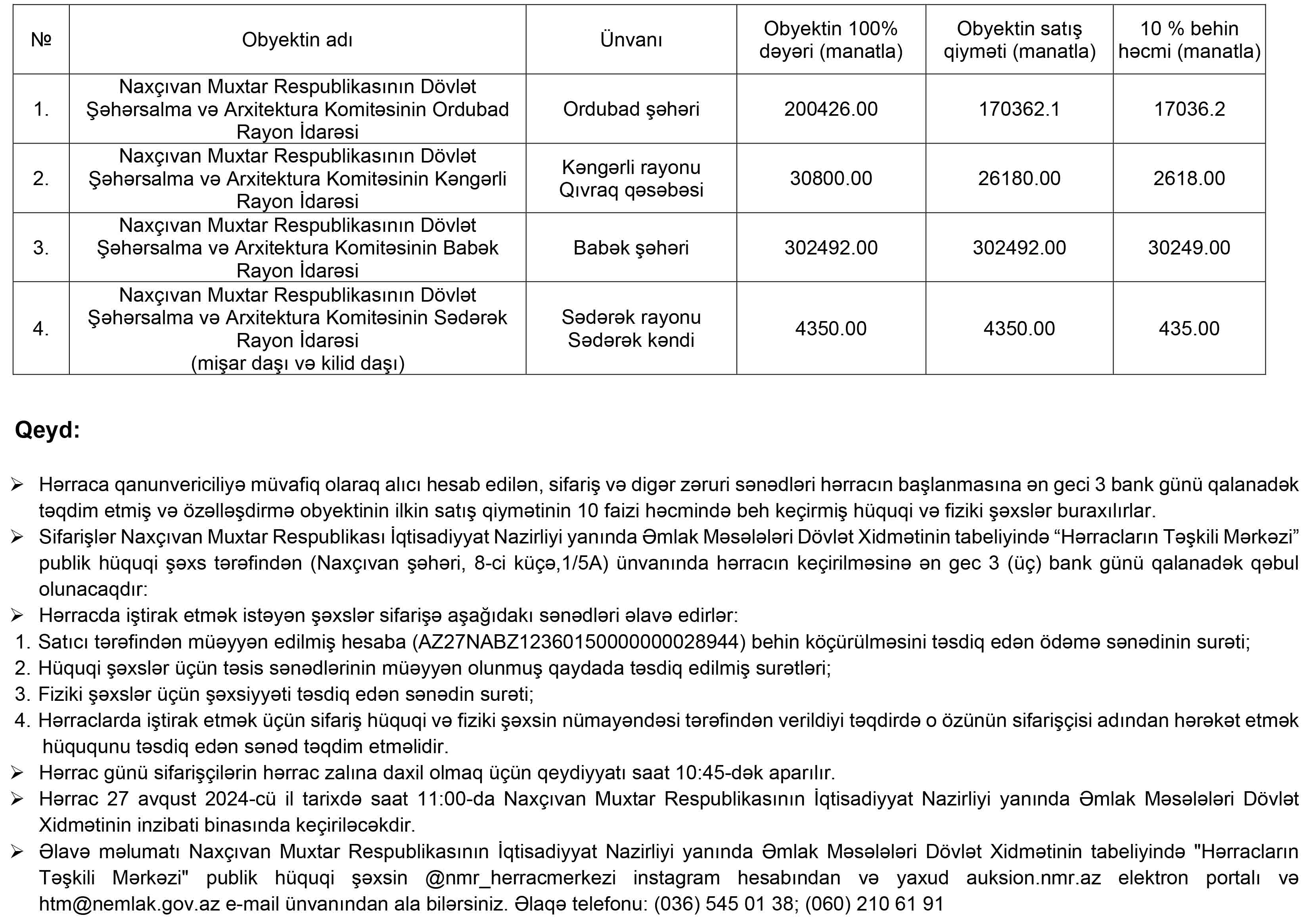 Naxçıvan MR İqtisadiyyat Nazirliyi yanında Əmlak Məsələləri Dövlət Xidmətinin tabeliyində “Hərracların Təşkili Mərkəzi” publik hüquqi şəxs tərəfindən 27 avqust 2024-cü il tarixdə hərraca çıxarılacaq kiçik dövlət müəssisələri haqqında məlumat