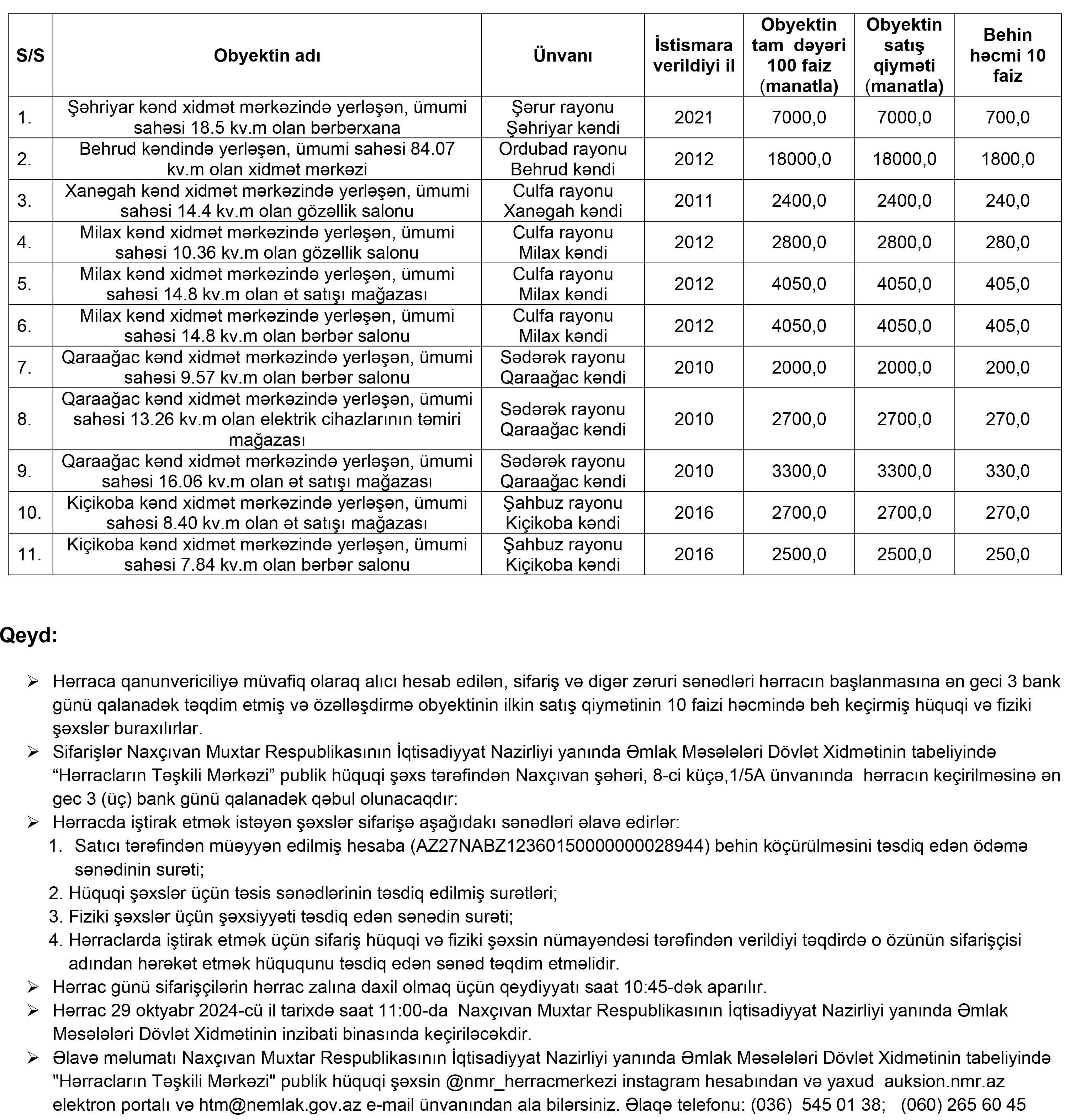 Naxçıvan MR İqtisadiyyat Nazirliyi yanında Əmlak Məsələləri Dövlət Xidmətinin tabeliyində “Hərracların Təşkili Mərkəzi” publik hüquqi şəxs tərəfindən 29 oktyabr 2024- cü il tarixdə hərraca çıxarılacaq qeyri-yaşayış sahələrinə dair məlumat