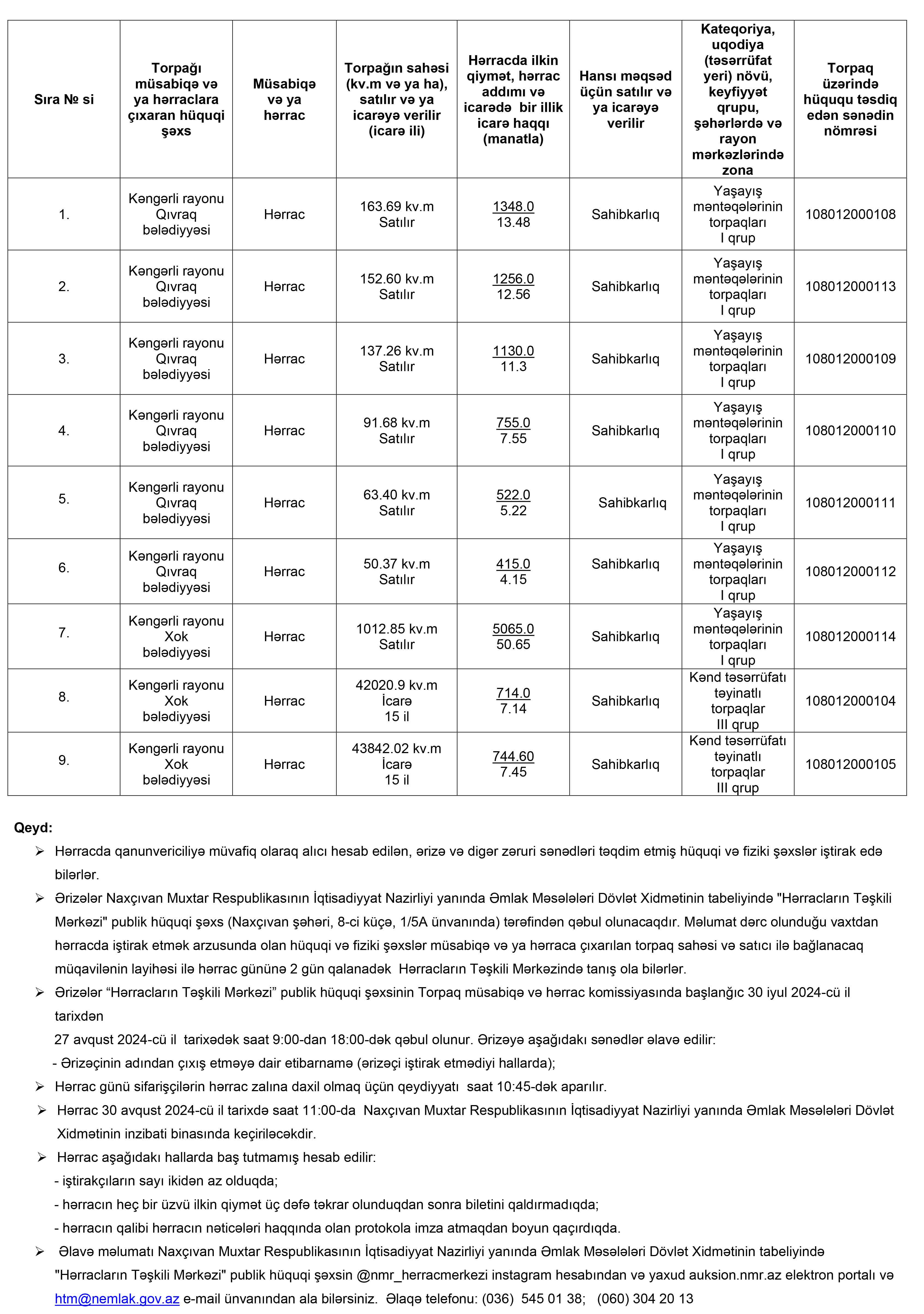 Naxçıvan MR İqtisadiyyat Nazirliyi yanında Əmlak Məsələləri Dövlət Xidmətinin tabeliyində “Hərracların Təşkili Mərkəzi” publik hüquqi şəxs tərəfindən 30 avqust 2024-cü il tarixdə keçiriləcək torpaq hərracları haqqında məlumat