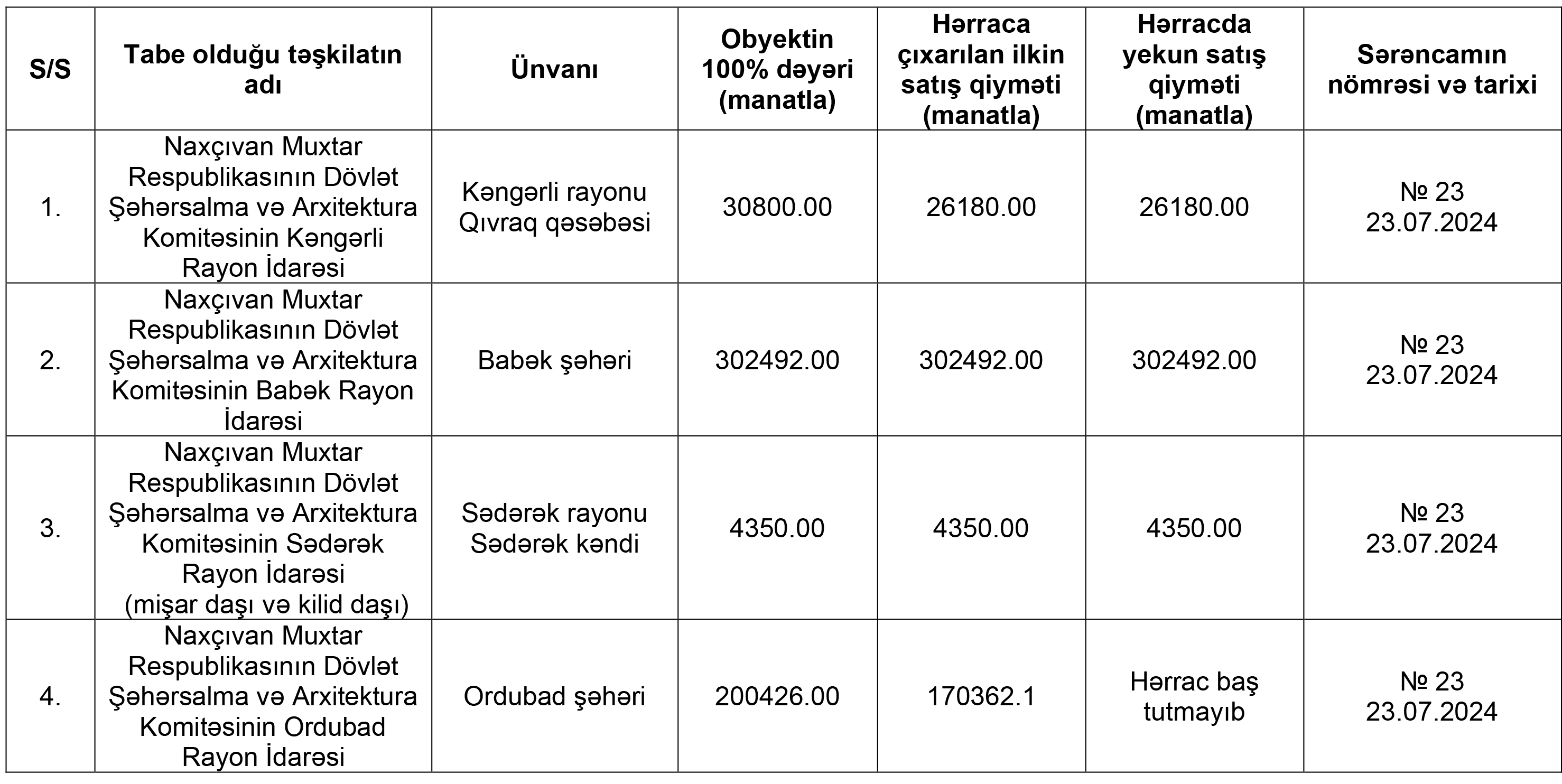 Naxçıvan MR İqtisadiyyat Nazirliyi yanında Əmlak Məsələləri Dövlət Xidmətinin tabeliyində “Hərracların Təşkili Mərkəzi” publik hüquqi şəxs tərəfindən kiçik dövlət müəssisələrinin satışı üzrə 27 avqust 2024-cü il tarixdə keçirilmiş hərracın nəticəsi