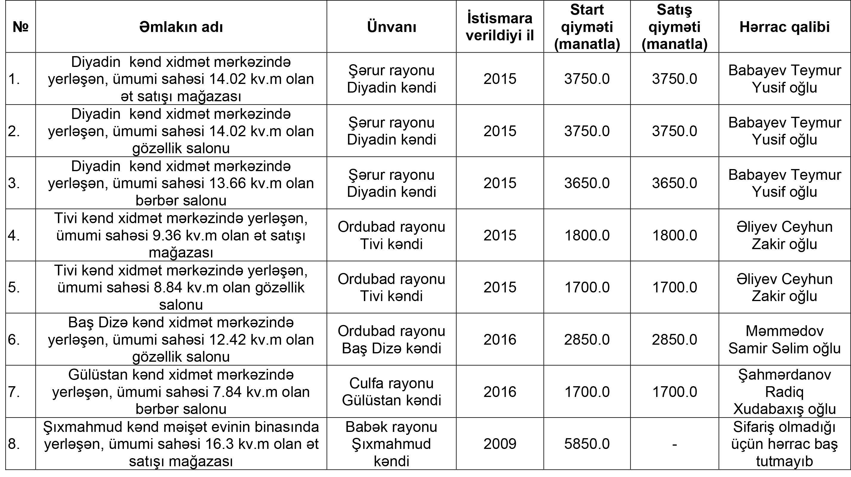 Naxçıvan MR İqtisadiyyat Nazirliyi yanında Əmlak Məsələləri Dövlət Xidmətinin tabeliyində Hərracların Təşkili Mərkəzi publik hüquqi şəxs tərəfindən qeyri-yaşayış sahələrinin özəlləşdirilməsi üzrə 29 avqust 2024-cü il tarixdə keçirilmiş hərracın nəticəsi