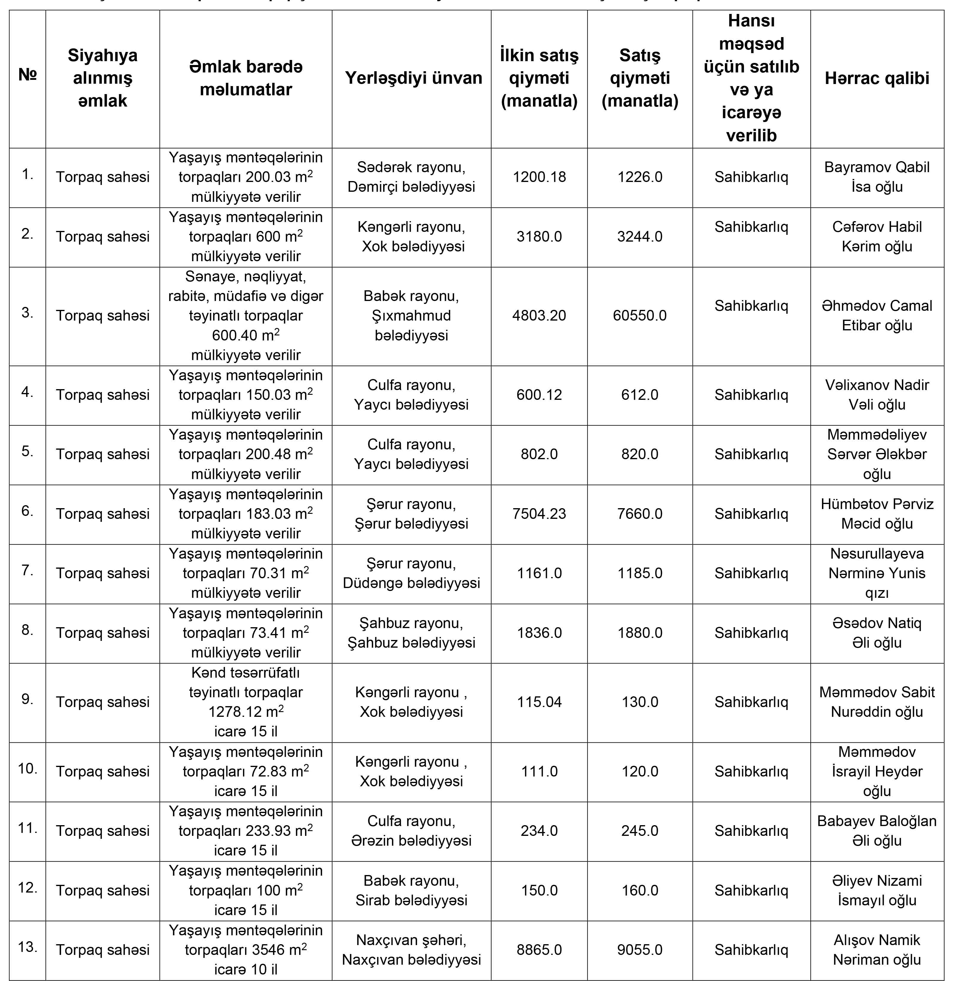 Naxçıvan Muxtar Respublikasının İqtisadiyyat Nazirliyi yanında Əmlak Məsələləri Dövlət Xidmətinin tabeliyində “Hərracların Təşkili Mərkəzi” publik hüquqi şəxs tərəfindən 03 iyul 2025-ci il tarixdə keçirilmiş torpaq hərraclarının nəticəsi