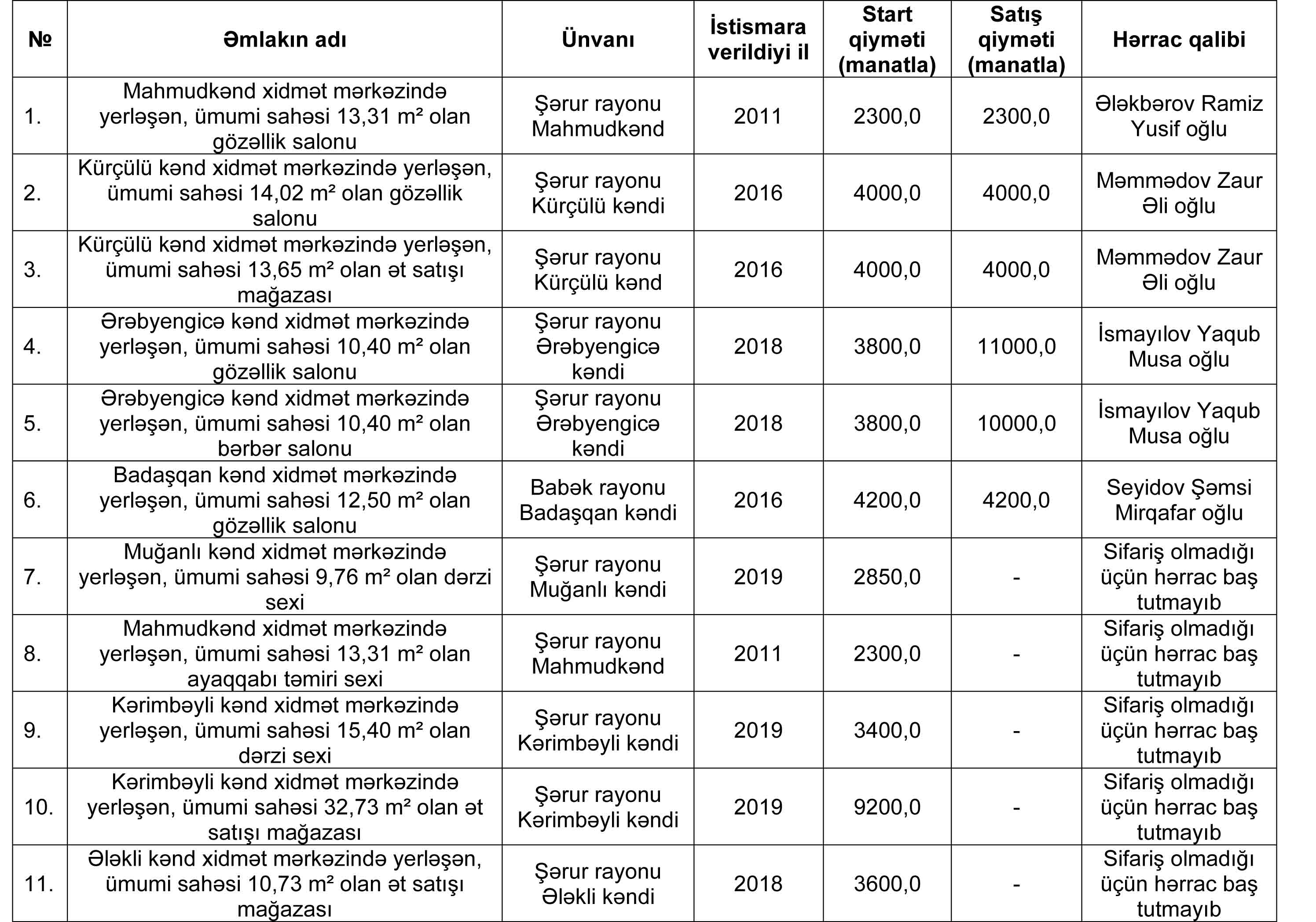 Naxçıvan Muxtar Respublikasının İqtisadiyyat Nazirliyi yanında Əmlak Məsələləri Dövlət Xidmətinin tabeliyində “Hərracların Təşkili Mərkəzi” publik hüquqi şəxs tərəfindən 08 may 2025-cü il tarixdə keçirilmiş hərracın nəticəsi