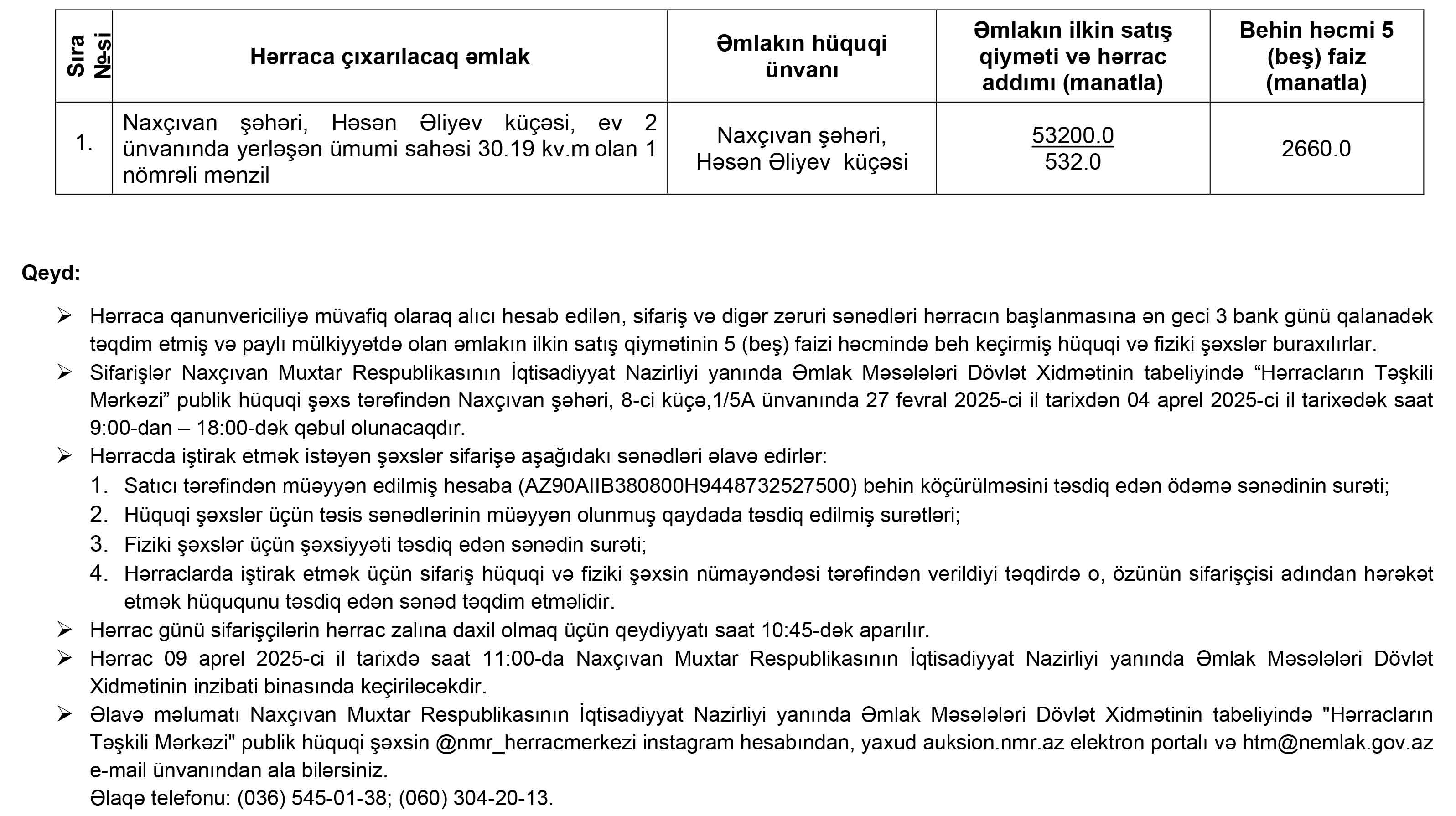 Naxçıvan Muxtar Respublikasının İqtisadiyyat Nazirliyi yanında Əmlak Məsələləri Dövlət Xidmətinin tabeliyində “Hərracların Təşkili Mərkəzi” publik hüquqi şəxs tərəfindən 09 aprel 2025-ci il tarixdə hərraca çıxarılacaq əmlak haqqında məlumat