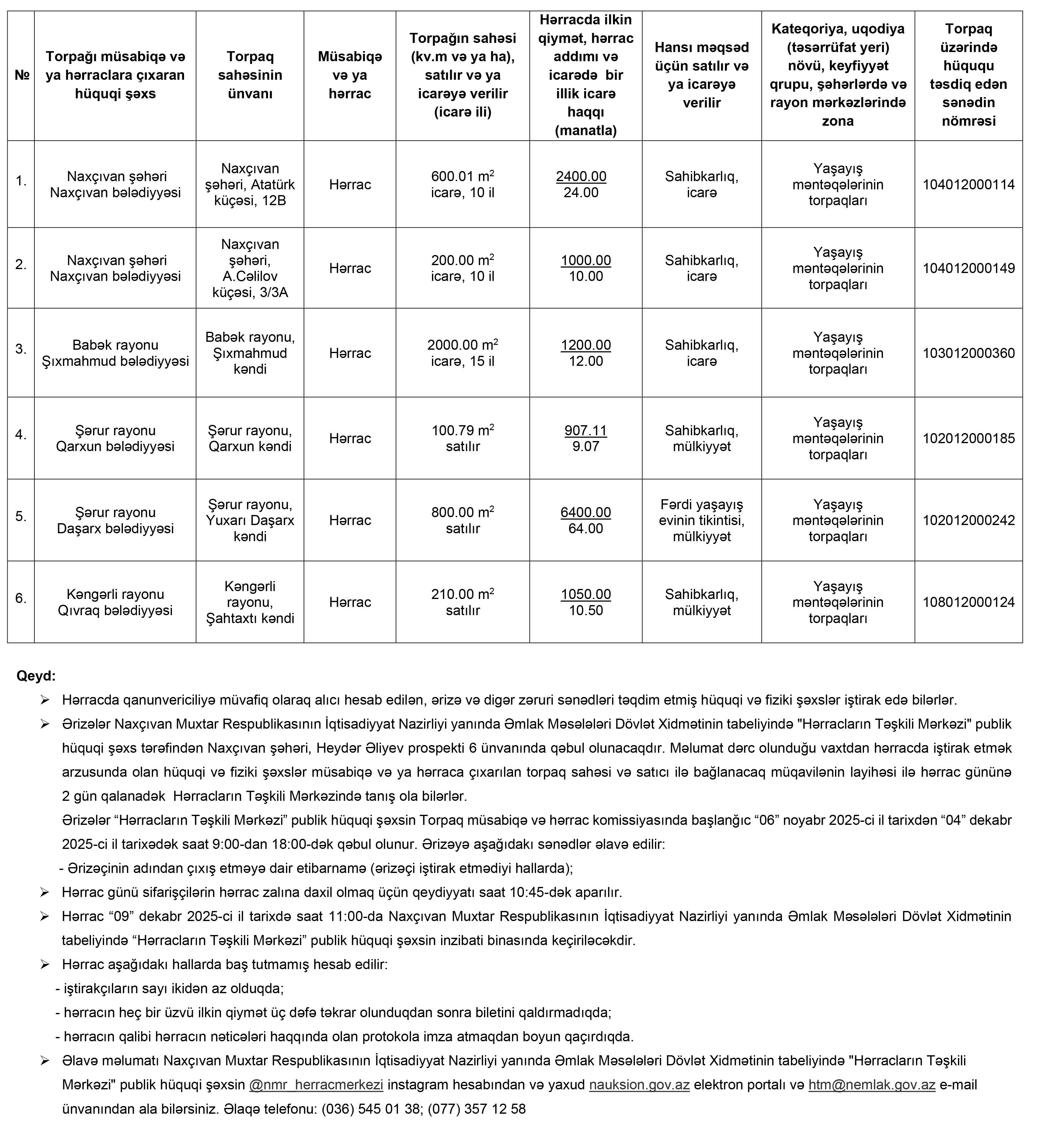 Naxçıvan Muxtar Respublikasının İqtisadiyyat Nazirliyi yanında Əmlak Məsələləri Dövlət Xidmətinin tabeliyində “Hərracların Təşkili Mərkəzi” publik hüquqi şəxs tərəfindən 09 dekabr 2025-ci il tarixdə keçiriləcək torpaq hərracları haqqında məlumat