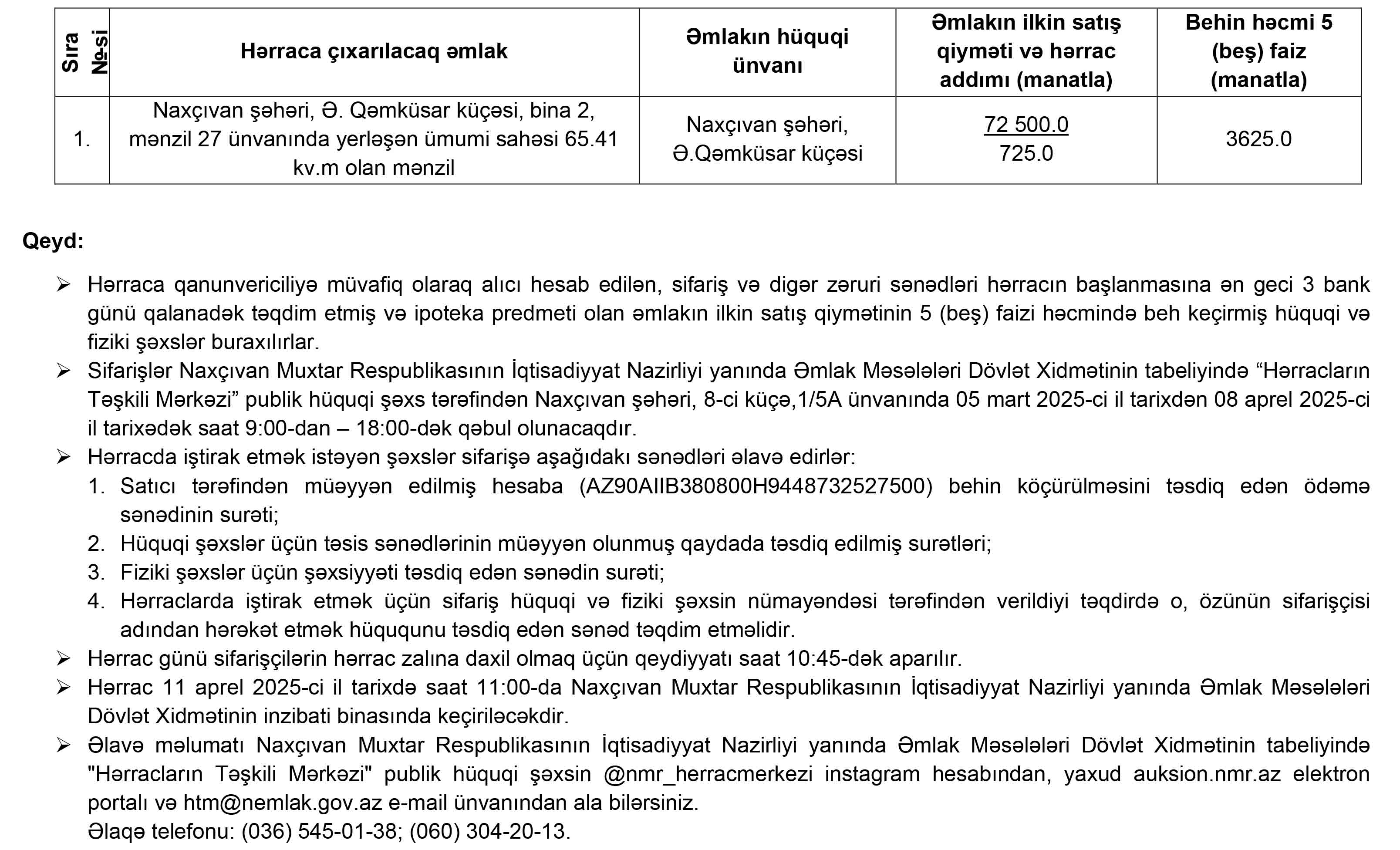Naxçıvan Muxtar Respublikasının İqtisadiyyat Nazirliyi yanında Əmlak Məsələləri Dövlət Xidmətinin tabeliyində “Hərracların Təşkili Mərkəzi” publik hüquqi şəxs tərəfindən 11 aprel 2025-ci il tarixdə hərraca çıxarılacaq əmlak haqqında məlumat