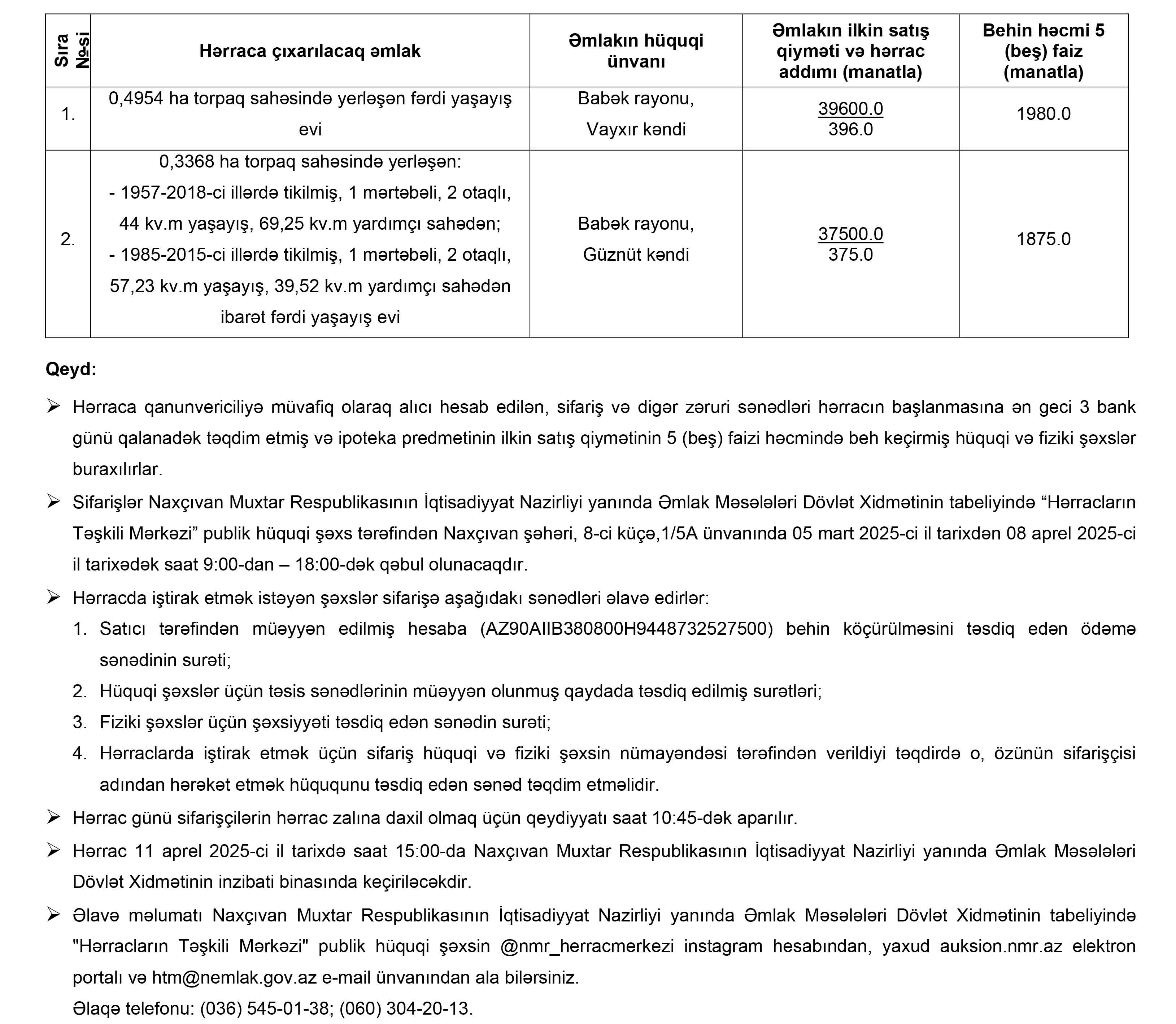 Naxçıvan Muxtar Respublikasının İqtisadiyyat Nazirliyi yanında Əmlak Məsələləri Dövlət Xidmətinin tabeliyində “Hərracların Təşkili Mərkəzi” publik hüquqi şəxs tərəfindən 11 aprel 2025-ci il tarixdə hərraca çıxarılacaq əmlaklar haqqında məlumat