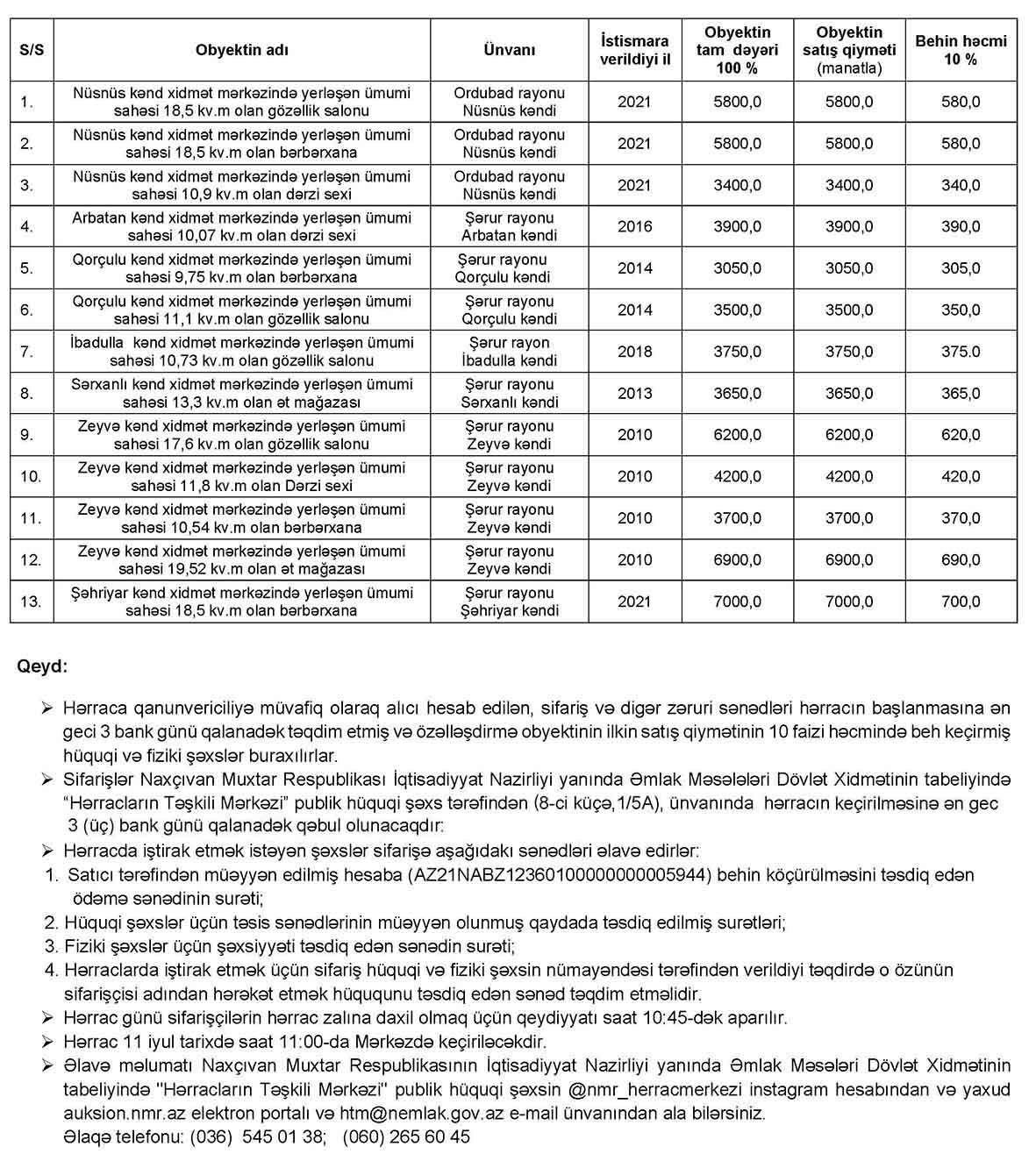 Naxçıvan Muxtar Respublikasının İqtisadiyyat Nazirliyi yanında Əmlak Məsələləri Dövlət Xidmətinin tabeliyində “Hərracların Təşkili Mərkəzi” publik hüquqi şəxs tərəfindən 11 iyul 2024-cü il tarixdə hərraca çıxarılacaq özəlləşdirmə obyektləri barədə məlumat