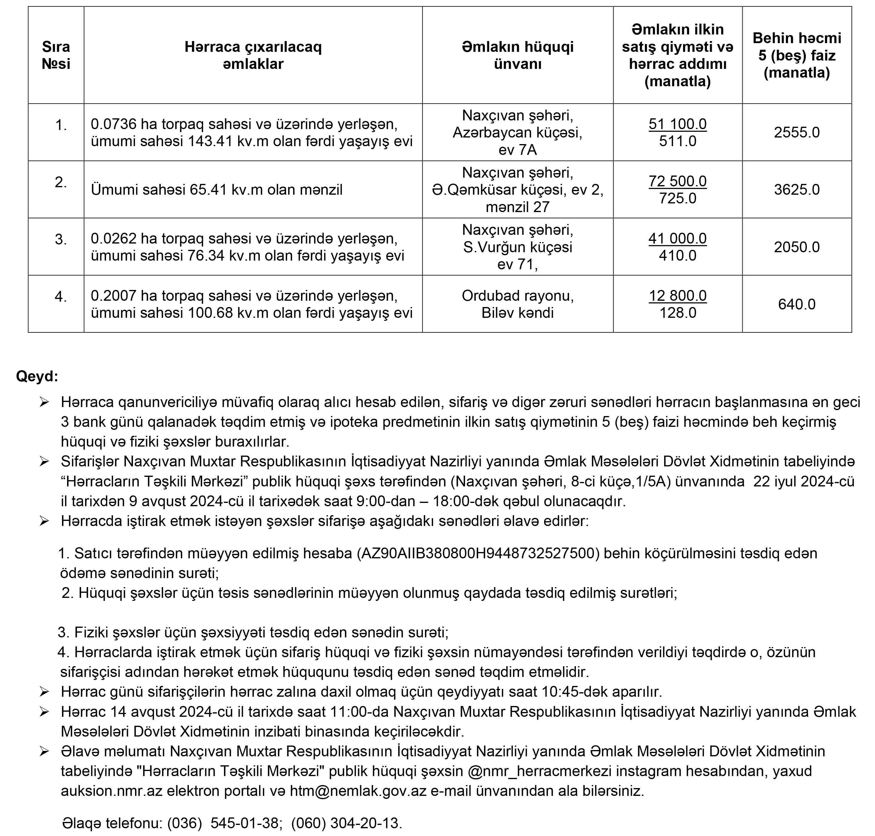 Naxçıvan Muxtar Respublikasının İqtisadiyyat Nazirliyi yanında Əmlak Məsələləri Dövlət Xidmətinin tabeliyində “Hərracların Təşkili Mərkəzi” publik hüquqi şəxs tərəfindən 14 avqust 2024-cü il tarixdə hərraca çıxarılacaq əmlaklar haqqında məlumat
