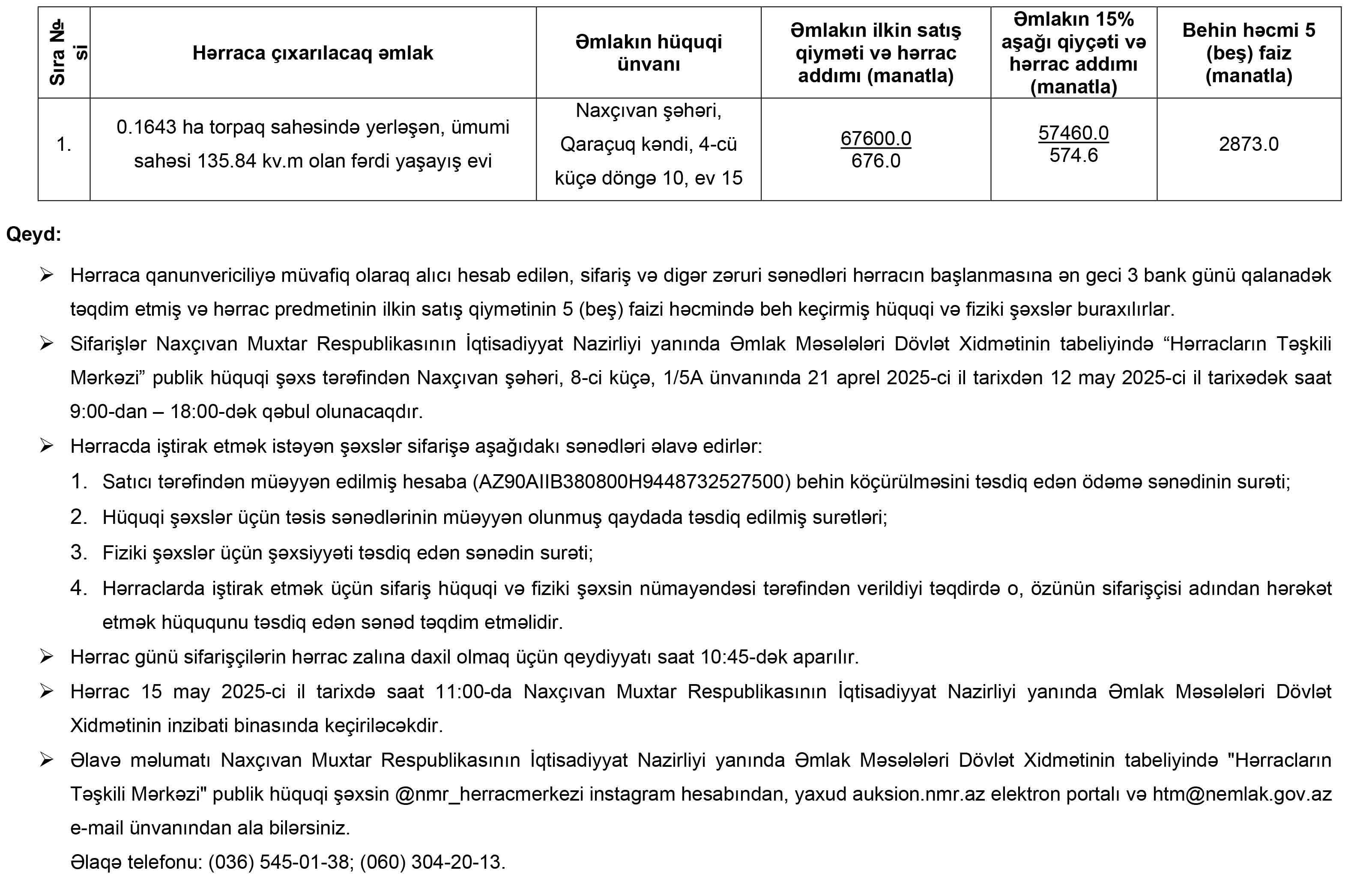 Naxçıvan Muxtar Respublikasının İqtisadiyyat Nazirliyi yanında Əmlak Məsələləri Dövlət Xidmətinin tabeliyində “Hərracların Təşkili Mərkəzi” publik hüquqi şəxs tərəfindən 15 may 2025-ci il tarixdə hərraca çıxarılacaq əmlaklar haqqında məlumat