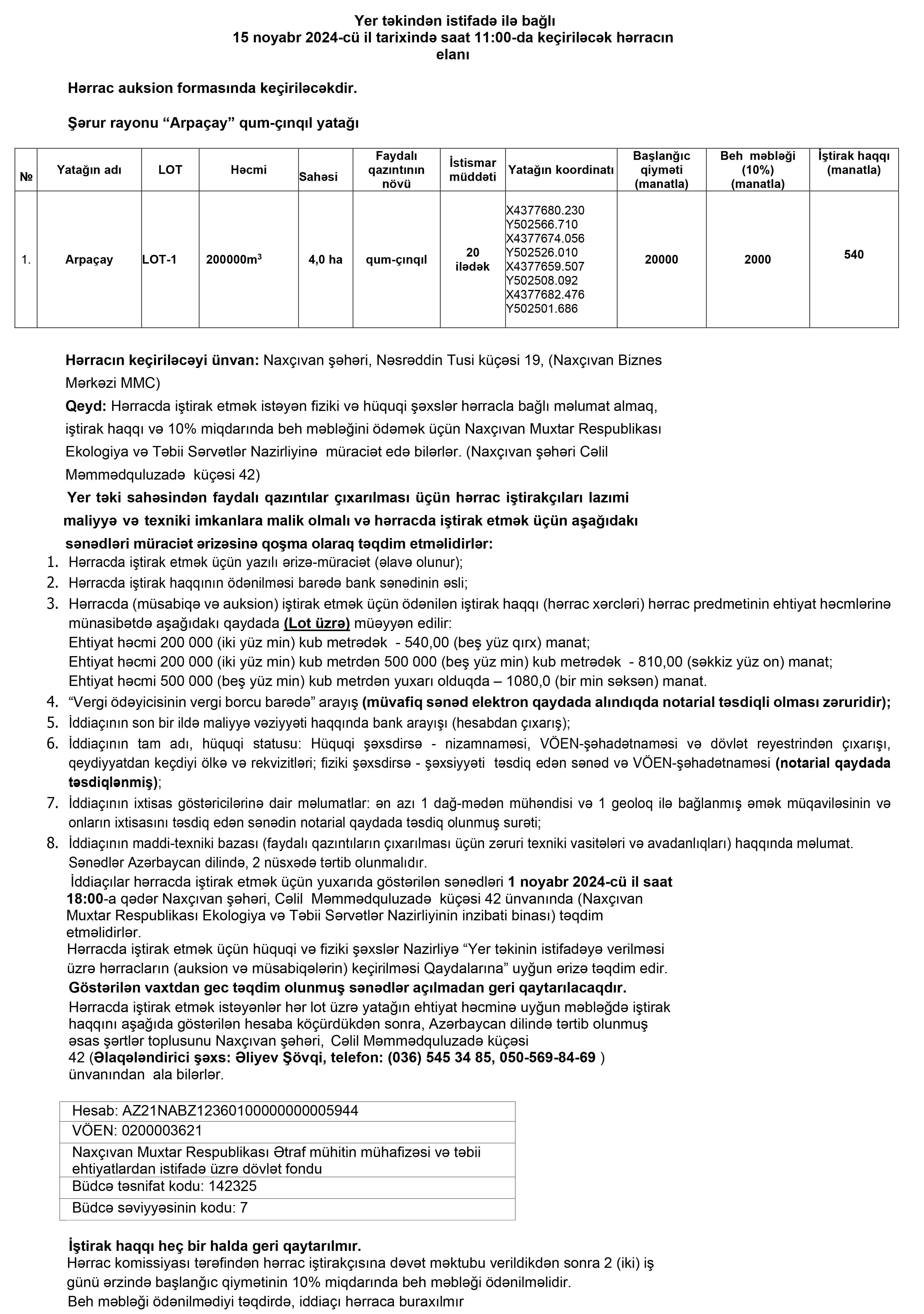 Naxçıvan Muxtar Respublikasının İqtisadiyyat Nazirliyi yanında Əmlak Məsələləri Dövlət Xidmətinin tabeliyində “Hərracların Təşkili Mərkəzi” publik hüquqi şəxs tərəfindən 15 noyabr 2024-cü il tarixində keçiriləcək hərrac haqqında məlumat