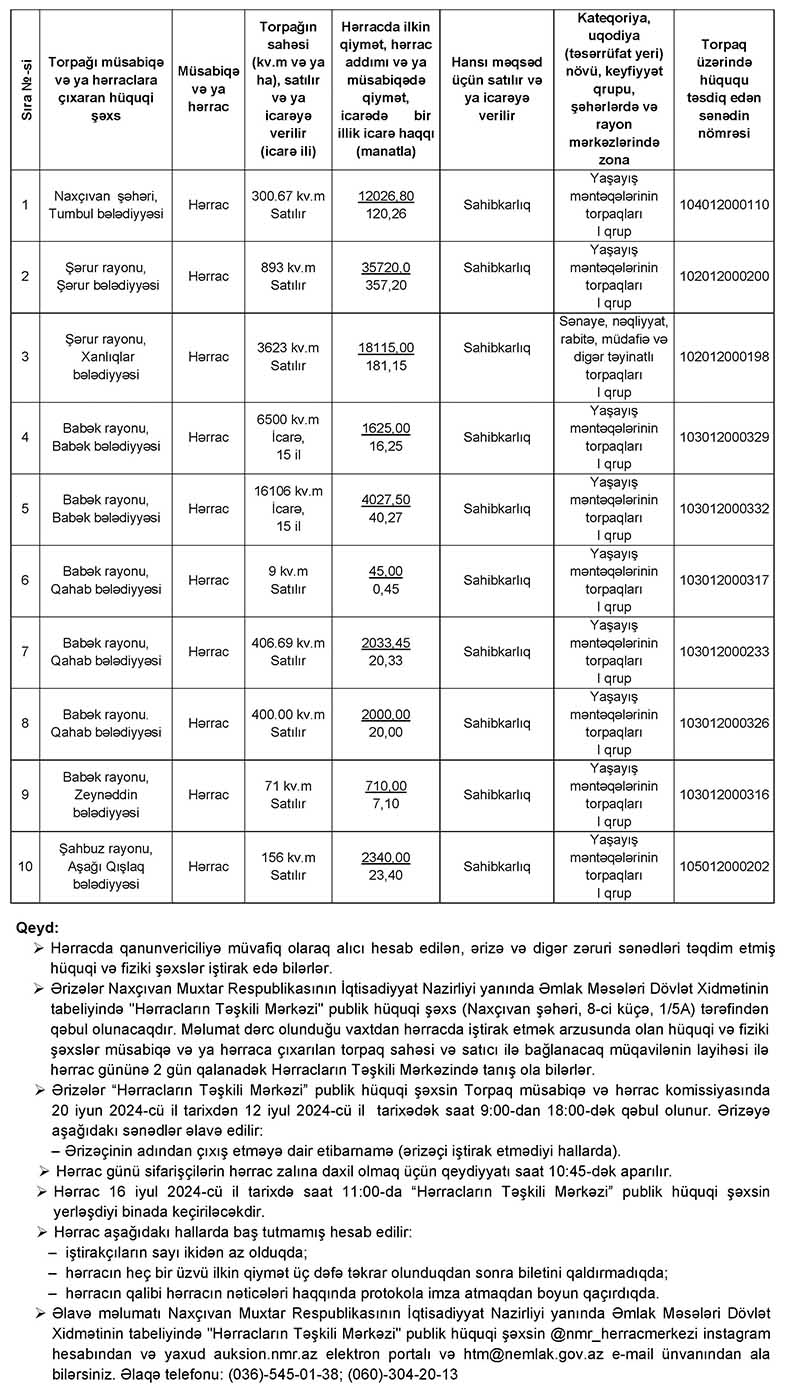 Naxçıvan Muxtar Respublikasının İqtisadiyyat Nazirliyi yanında Əmlak Məsələləri Dövlət Xidmətinin tabeliyində “Hərracların Təşkili Mərkəzi” publik hüquqi şəxs tərəfindən 16 iyul 2024-cü il tarixdə keçiriləcək torpaq hərracları haqqında məlumat