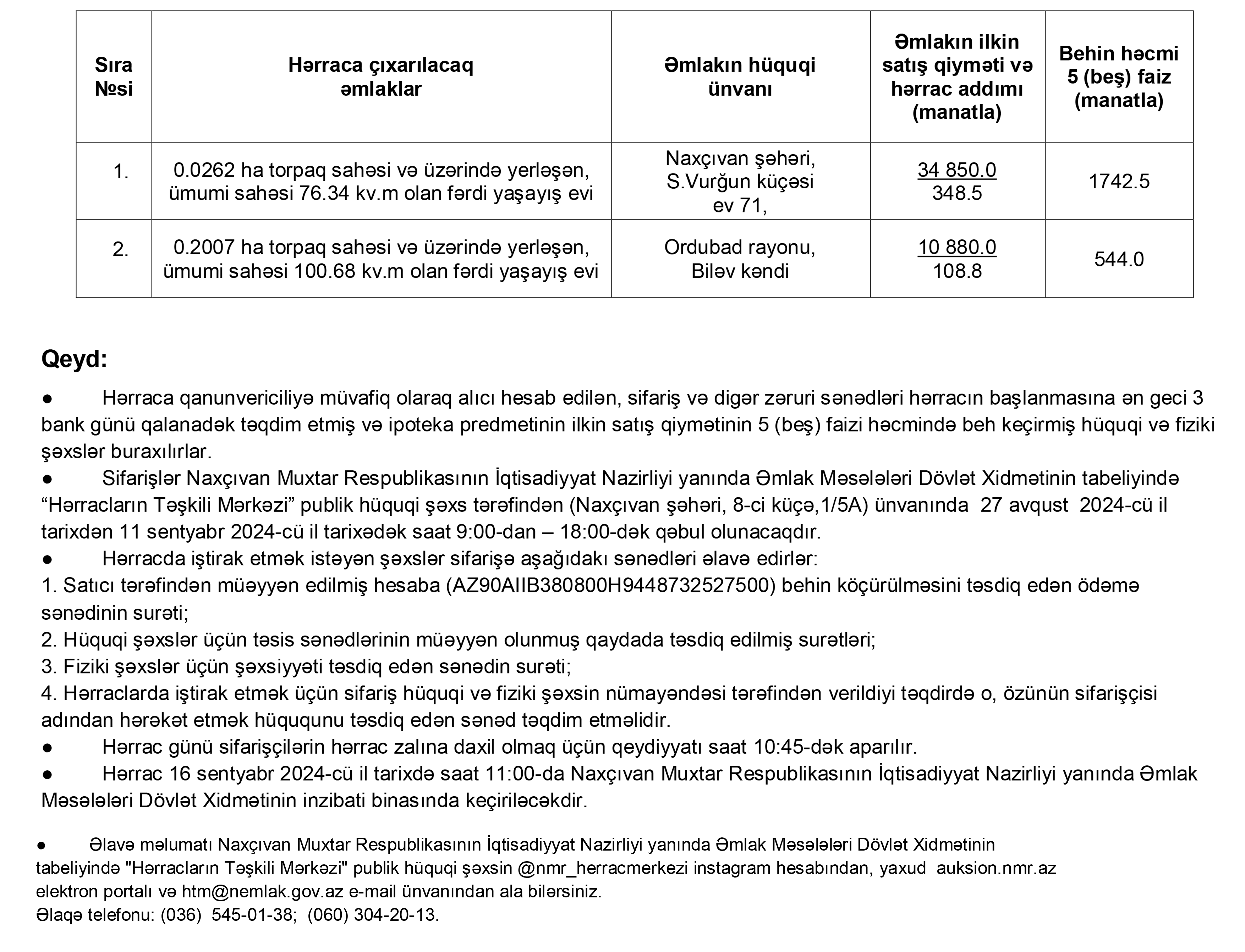 Naxçıvan Muxtar Respublikasının İqtisadiyyat Nazirliyi yanında Əmlak Məsələləri Dövlət Xidmətinin tabeliyində “Hərracların Təşkili Mərkəzi” publik hüquqi şəxs tərəfindən 16 sentyabr 2024-cü il tarixdə hərraca çıxarılacaq əmlaklar haqqında məlumat