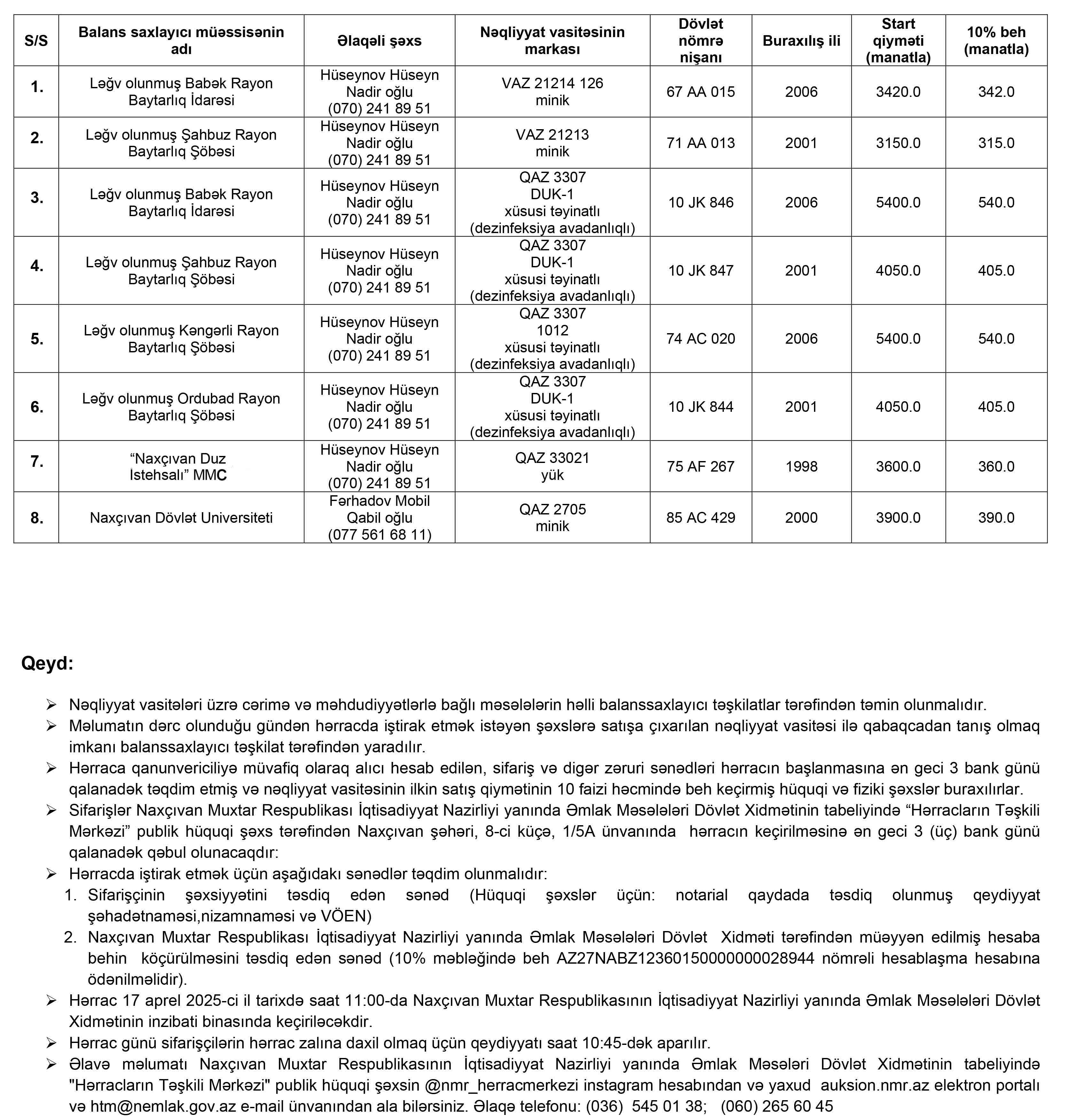 Naxçıvan Muxtar Respublikasının İqtisadiyyat Nazirliyi yanında Əmlak Məsələləri Dövlət Xidmətinin tabeliyində “Hərracların Təşkili Mərkəzi” publik hüquqi şəxs tərəfindən 17 aprel 2025-ci il tarixdə hərraca çıxarılacaq nəqliyyat vasitələrinin siyahısı