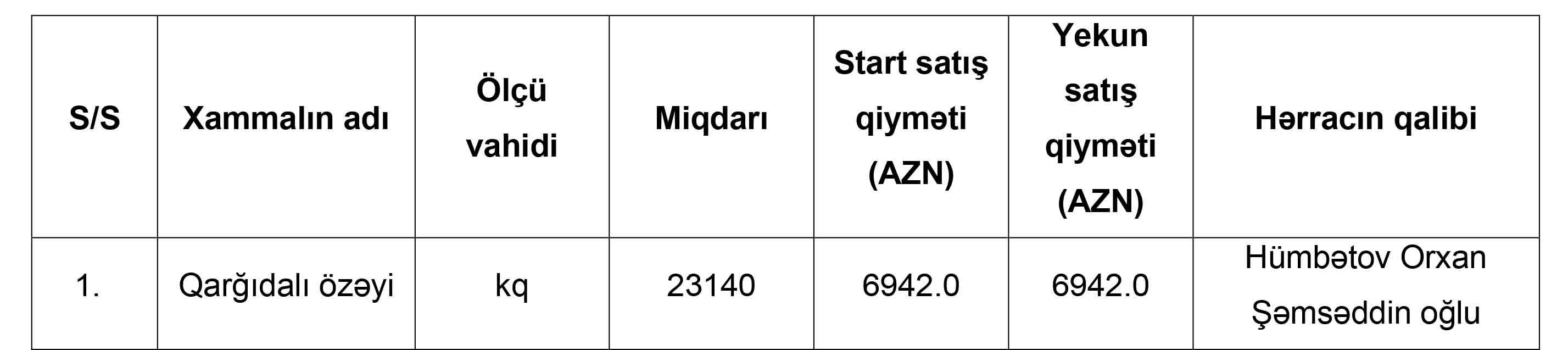 Naxçıvan Muxtar Respublikasının İqtisadiyyat Nazirliyi yanında Əmlak Məsələləri Dövlət Xidmətinin tabeliyində “Hərracların Təşkili Mərkəzi” publik hüquqi şəxs tərəfindən 17 iyun 2025-ci il tarixdə keçirilən xammalın satışı üzrə hərracın nəticəsi