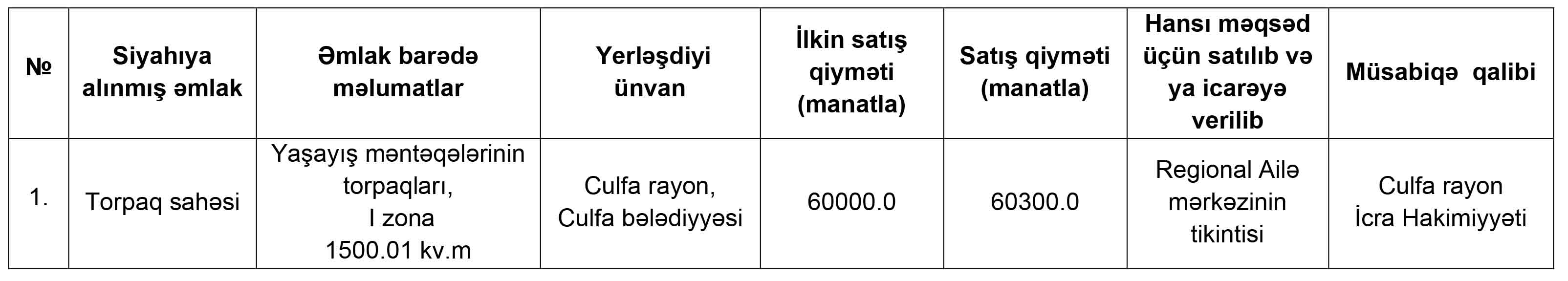 Naxçıvan Muxtar Respublikasının İqtisadiyyat Nazirliyi yanında Əmlak Məsələləri Dövlət Xidmətinin tabeliyində “Hərracların Təşkili Mərkəzi” publik hüquqi şəxs tərəfindən 17 oktyabr 2024-cü il tarixdə keçirilmiş torpaq müsabiqəsinin nəticəsi