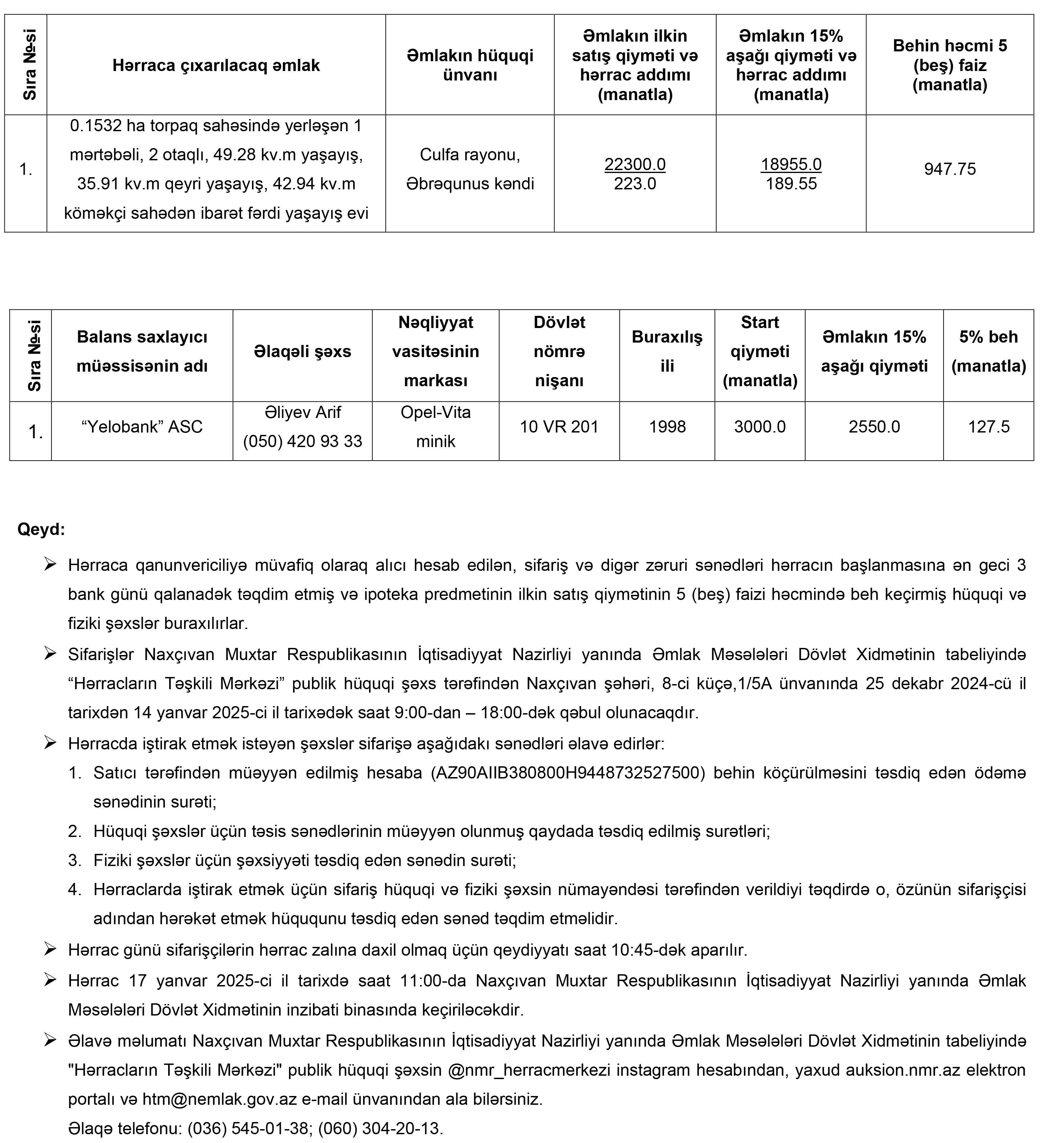 Naxçıvan Muxtar Respublikasının İqtisadiyyat Nazirliyi yanında Əmlak Məsələləri Dövlət Xidmətinin tabeliyində “Hərracların Təşkili Mərkəzi” publik hüquqi şəxs tərəfindən 17 yanvar 2025-ci il tarixdə hərraca çıxarılacaq əmlaklar haqqında məlumat