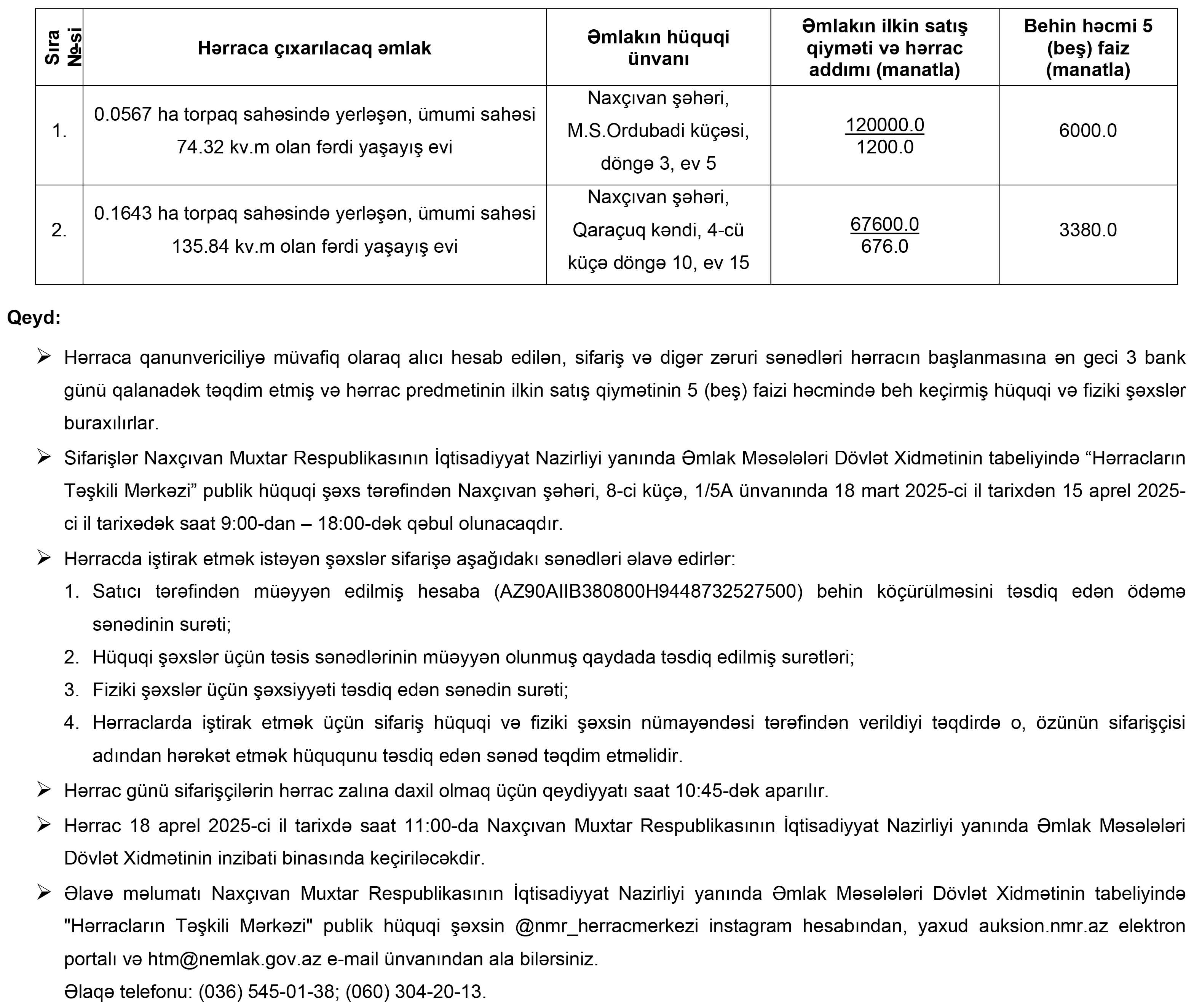 Naxçıvan Muxtar Respublikasının İqtisadiyyat Nazirliyi yanında Əmlak Məsələləri Dövlət Xidmətinin tabeliyində “Hərracların Təşkili Mərkəzi” publik hüquqi şəxs tərəfindən 18 aprel 2025-ci il tarixdə hərraca çıxarılacaq əmlaklar haqqında məlumat