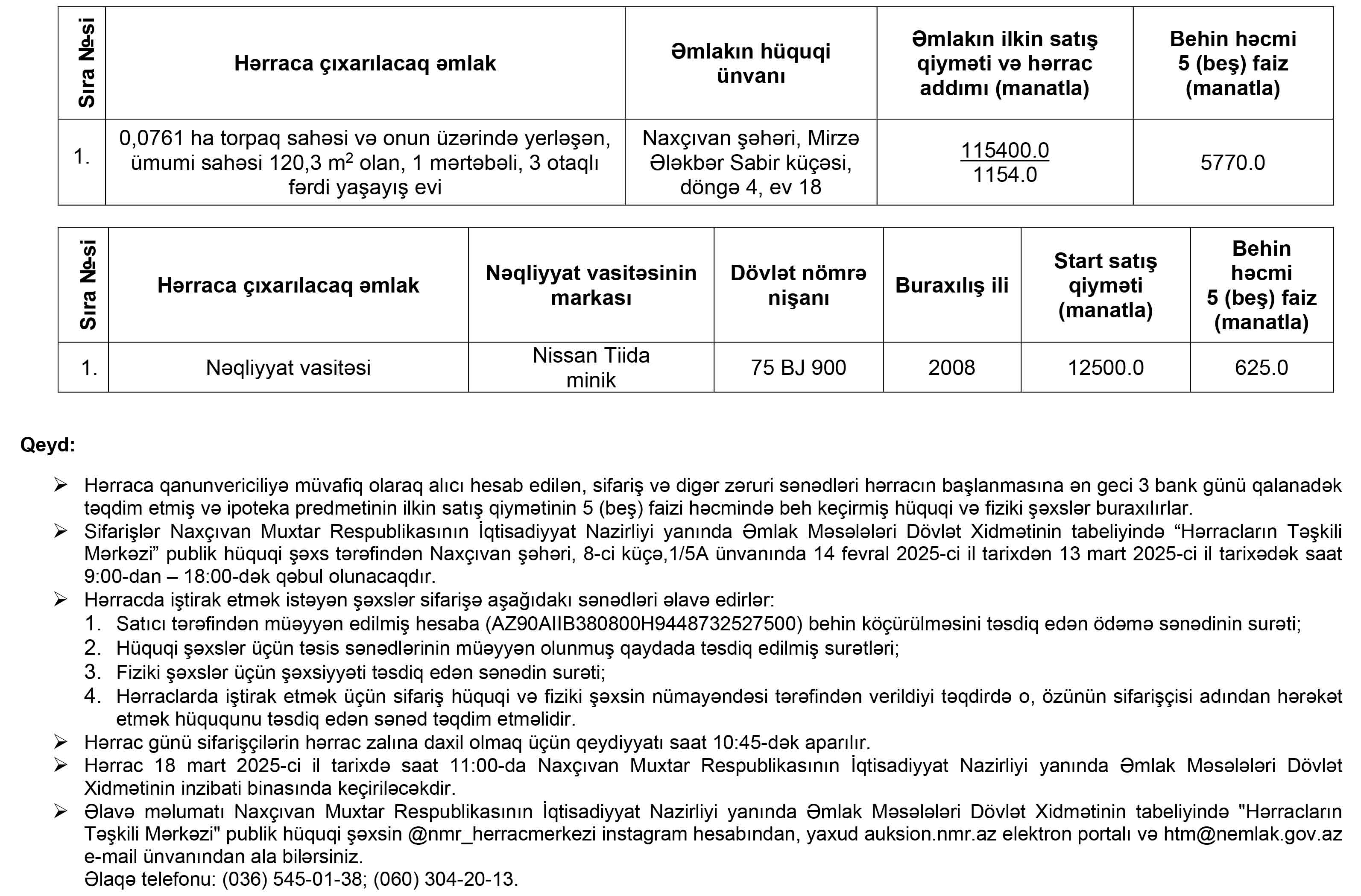 Naxçıvan Muxtar Respublikasının İqtisadiyyat Nazirliyi yanında Əmlak Məsələləri Dövlət Xidmətinin tabeliyində “Hərracların Təşkili Mərkəzi” publik hüquqi şəxs tərəfindən 18 mart 2025-ci il tarixdə hərraca çıxarılacaq əmlaklar haqqında məlumat