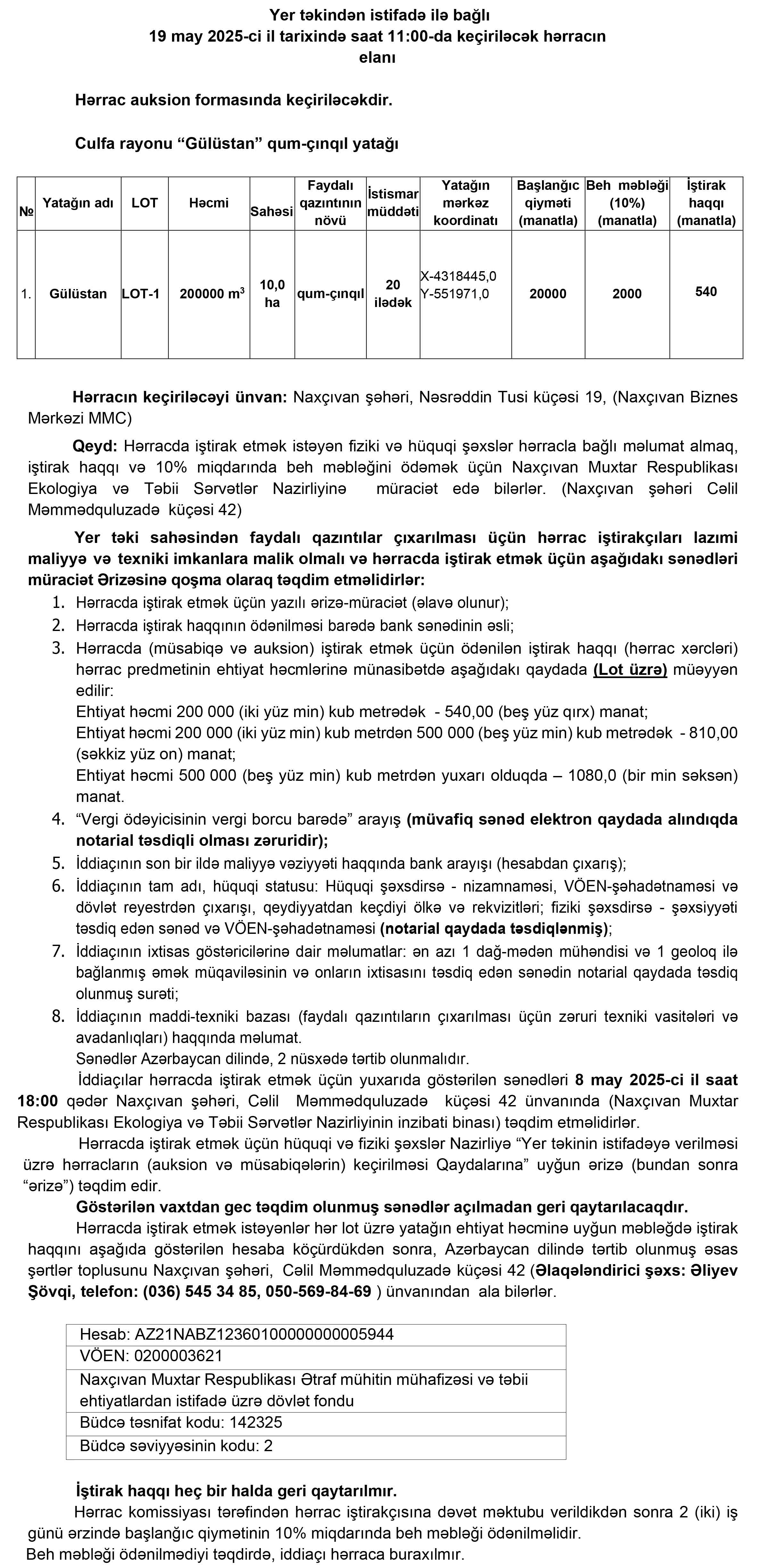 Naxçıvan Muxtar Respublikasının İqtisadiyyat Nazirliyi yanında Əmlak Məsələləri Dövlət Xidmətinin tabeliyində “Hərracların Təşkili Mərkəzi” publik hüquqi şəxs tərəfindən 19 may 2025-ci il tarixində keçiriləcək hərrac haqqında məlumat