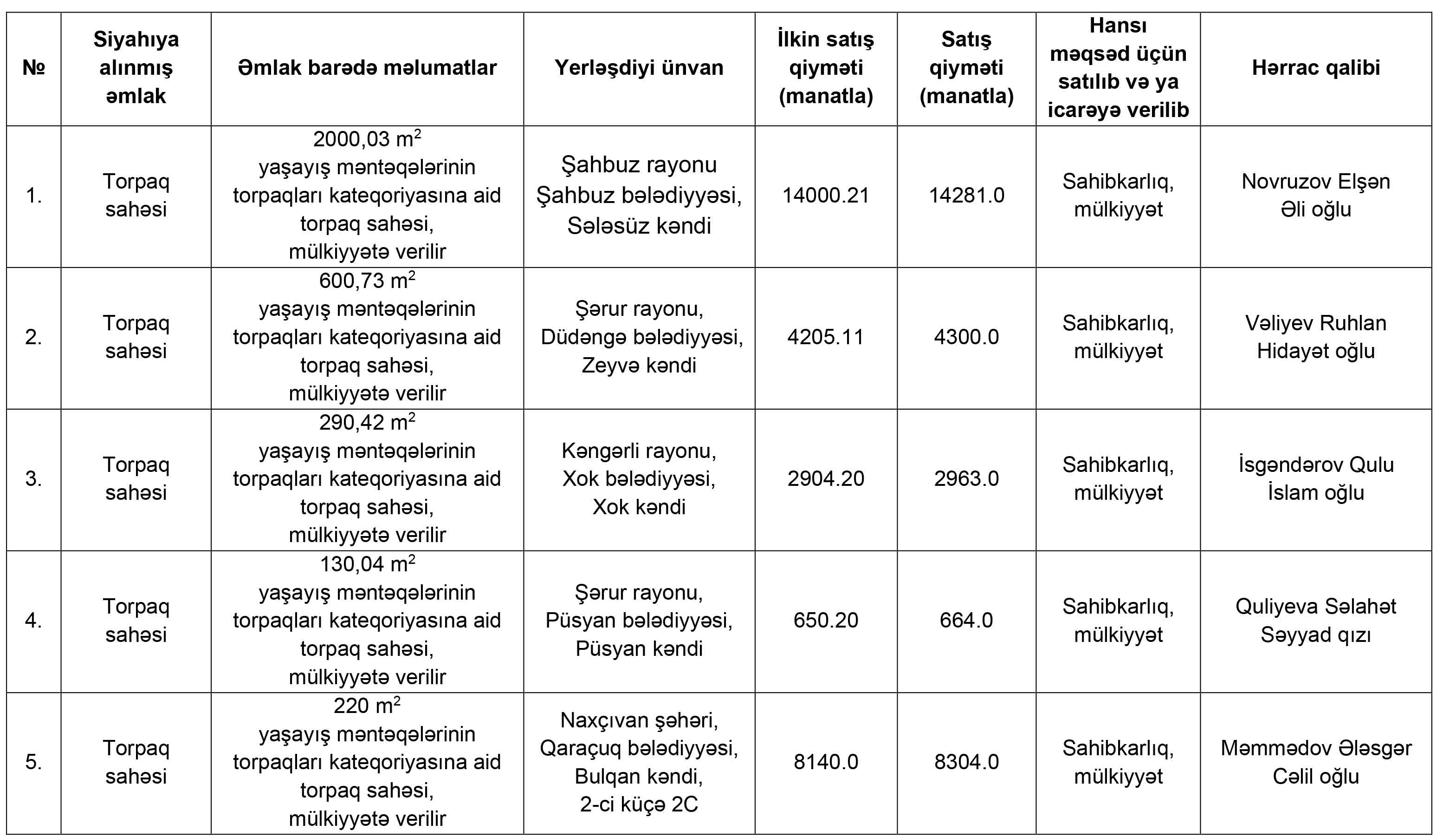 Naxçıvan Muxtar Respublikasının İqtisadiyyat Nazirliyi yanında Əmlak Məsələləri Dövlət Xidmətinin tabeliyində “Hərracların Təşkili Mərkəzi” publik hüquqi şəxs tərəfindən 20 noyabr 2025-ci il tarixdə keçirilmiş torpaq hərraclarının nəticəsi