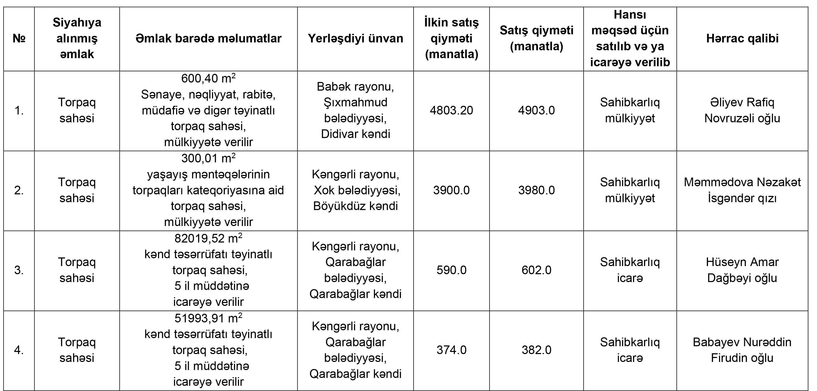 Naxçıvan Muxtar Respublikasının İqtisadiyyat Nazirliyi yanında Əmlak Məsələləri Dövlət Xidmətinin tabeliyində “Hərracların Təşkili Mərkəzi” publik hüquqi şəxs tərəfindən 20 oktyabr 2025-ci il tarixdə keçirilmiş torpaq hərraclarının nəticələri