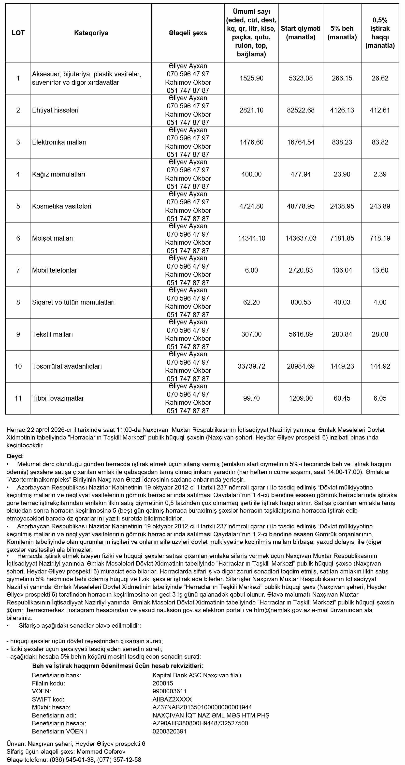 Naxçıvan Muxtar Respublikasının İqtisadiyyat Nazirliyi yanında Əmlak Məsələləri Dövlət Xidmətinin tabeliyində "Hərracların Təşkili Mərkəzi" publik hüquqi şəxs tərəfindən 22 aprel 2026-cı il tarixdә gömrük hәrracına çıxarılan dövlәt mülkiyyәtinә keçirilmiş mallar barədə məlumat