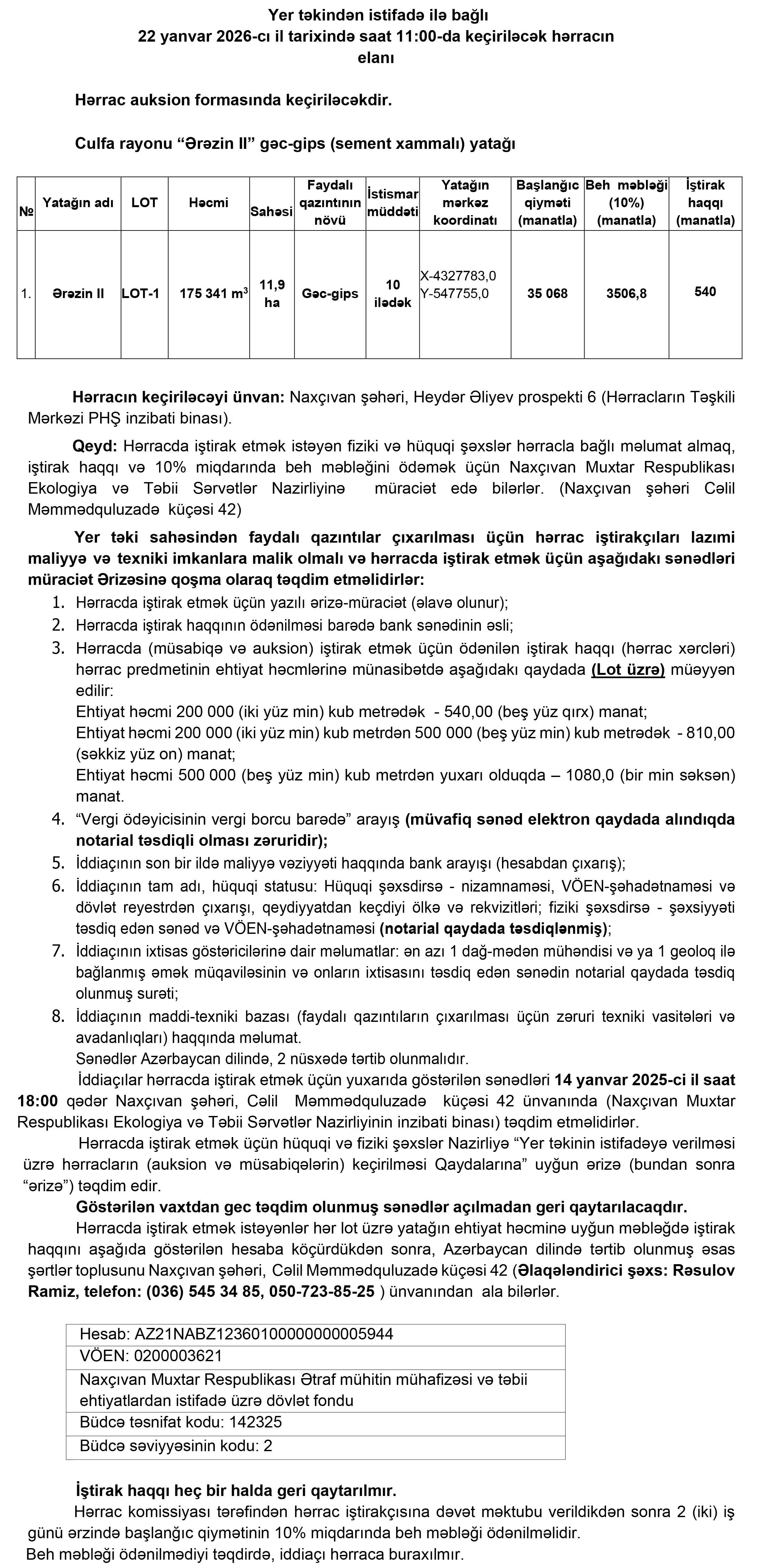 Naxçıvan Muxtar Respublikasının İqtisadiyyat Nazirliyi yanında Əmlak Məsələləri Dövlət Xidmətinin tabeliyində “Hərracların Təşkili Mərkəzi” publik hüquqi şəxs tərəfindən 22 yanvar 2026-cı il tarixində keçiriləcək hərrac haqqında məlumat