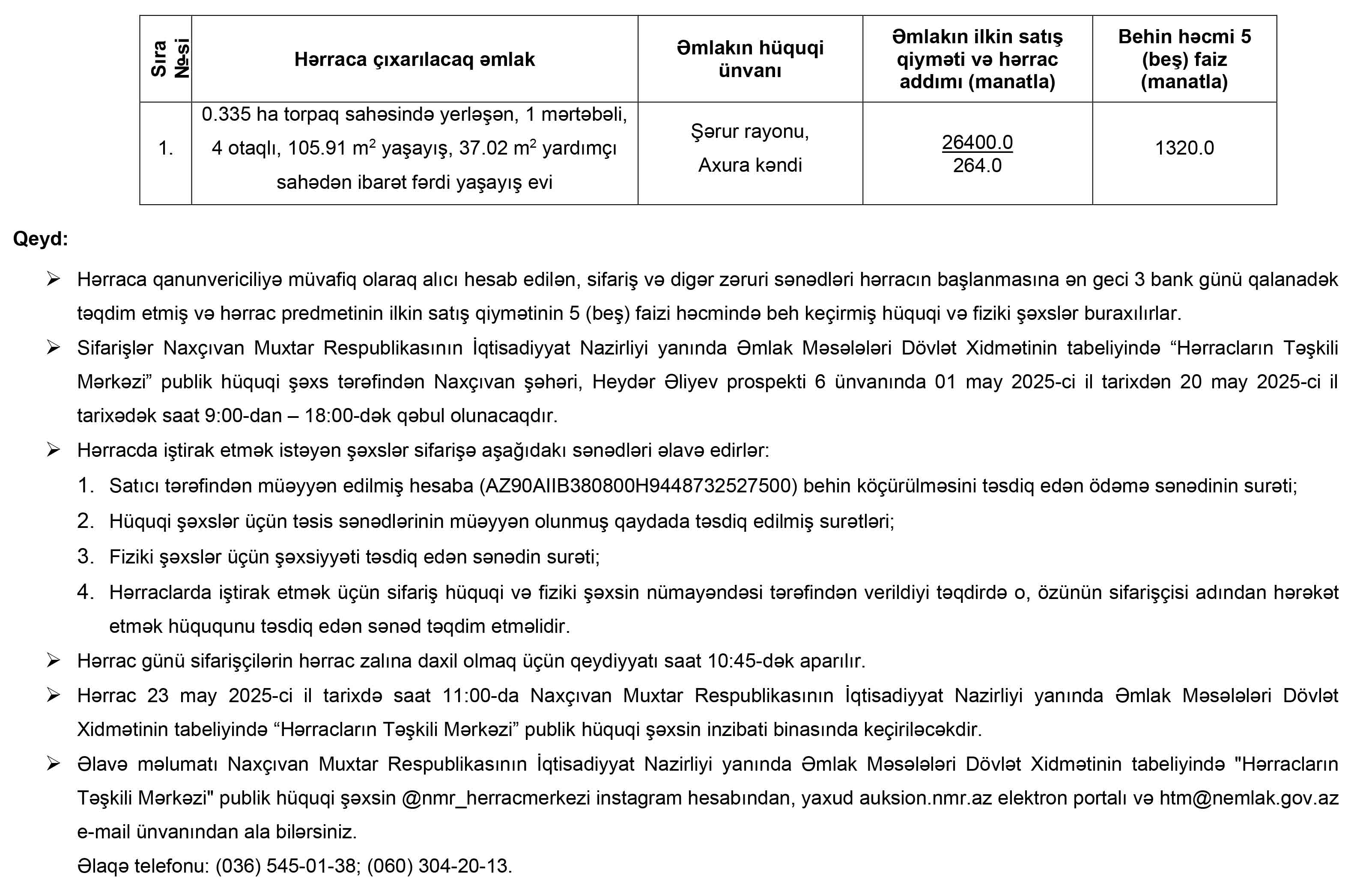 Naxçıvan Muxtar Respublikasının İqtisadiyyat Nazirliyi yanında Əmlak Məsələləri Dövlət Xidmətinin tabeliyində “Hərracların Təşkili Mərkəzi” publik hüquqi şəxs tərəfindən 23 may 2025-ci il tarixdə hərraca çıxarılacaq əmlaklar haqqında məlumat