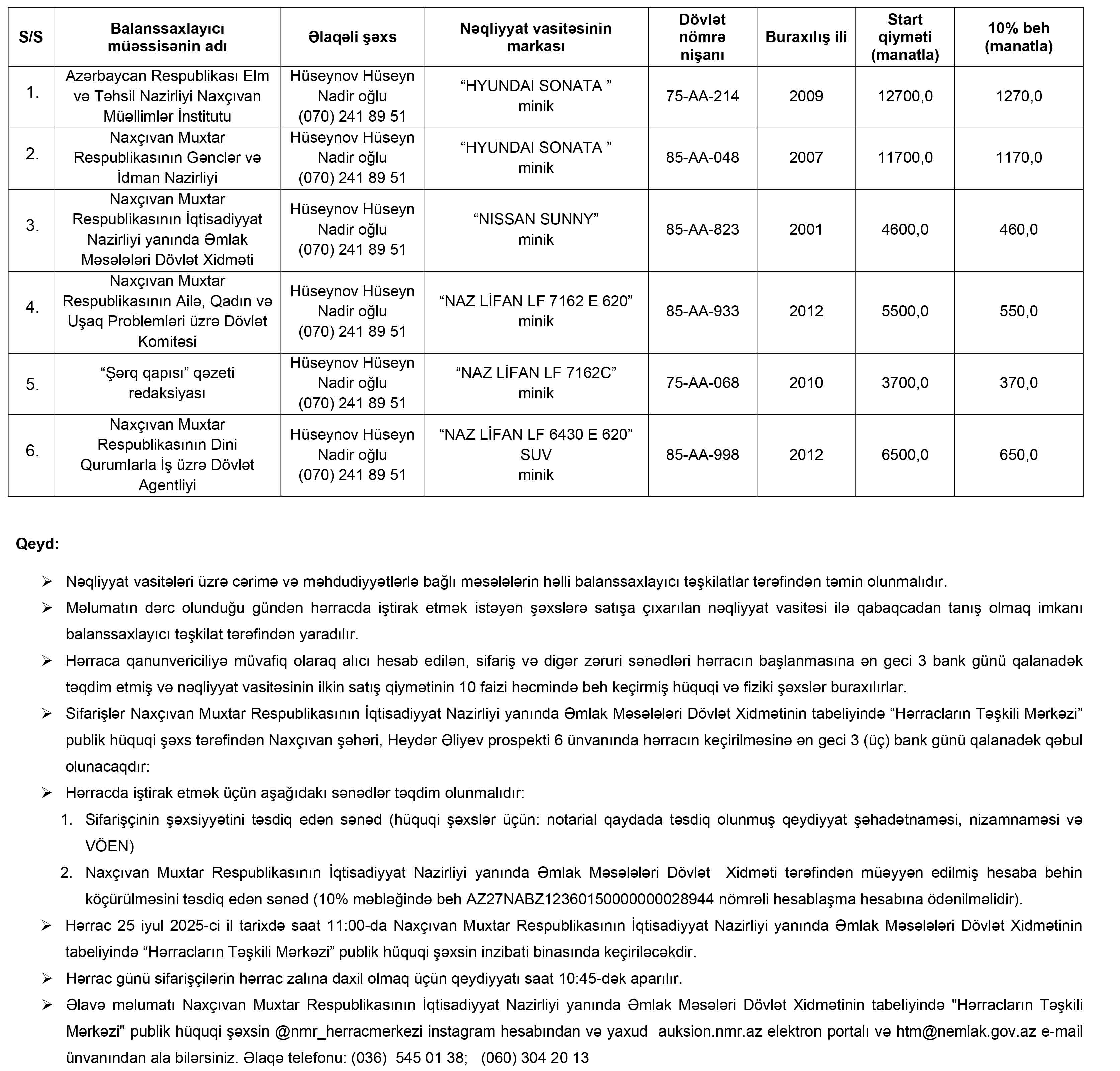 Naxçıvan Muxtar Respublikasının İqtisadiyyat Nazirliyi yanında Əmlak Məsələləri Dövlət Xidmətinin tabeliyində “Hərracların Təşkili Mərkəzi” publik hüquqi şəxs tərəfindən 25 iyul 2025-ci il tarixdə hərraca çıxarılacaq nəqliyyat vasitələrinin siyahısı