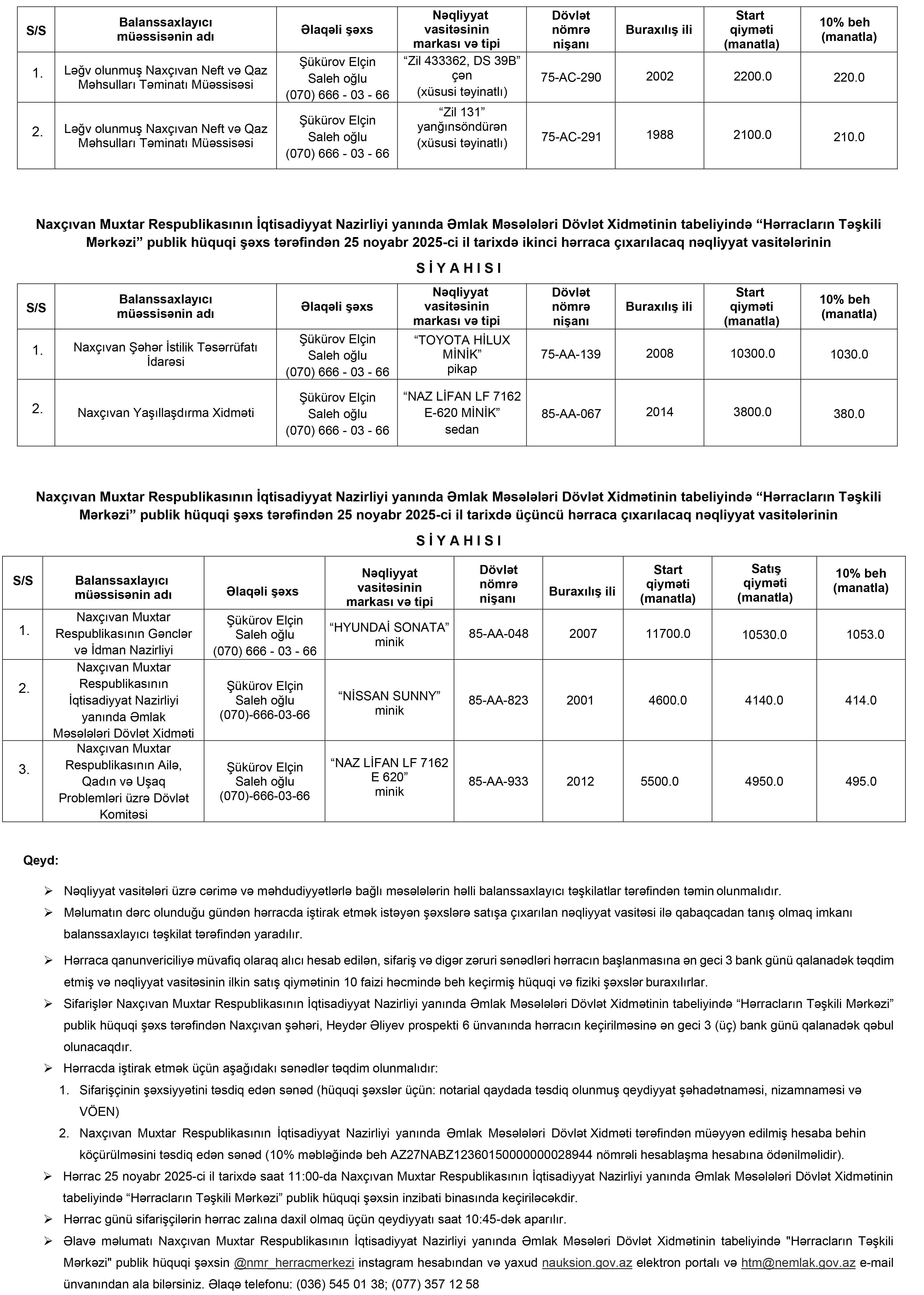 Mərkəzi” publik hüquqi şəxs tərəfindən 25 noyabr 2025-ci il tarixdə hərraca çıxarılacaq nəqliyyat vasitələrinin siyahısı