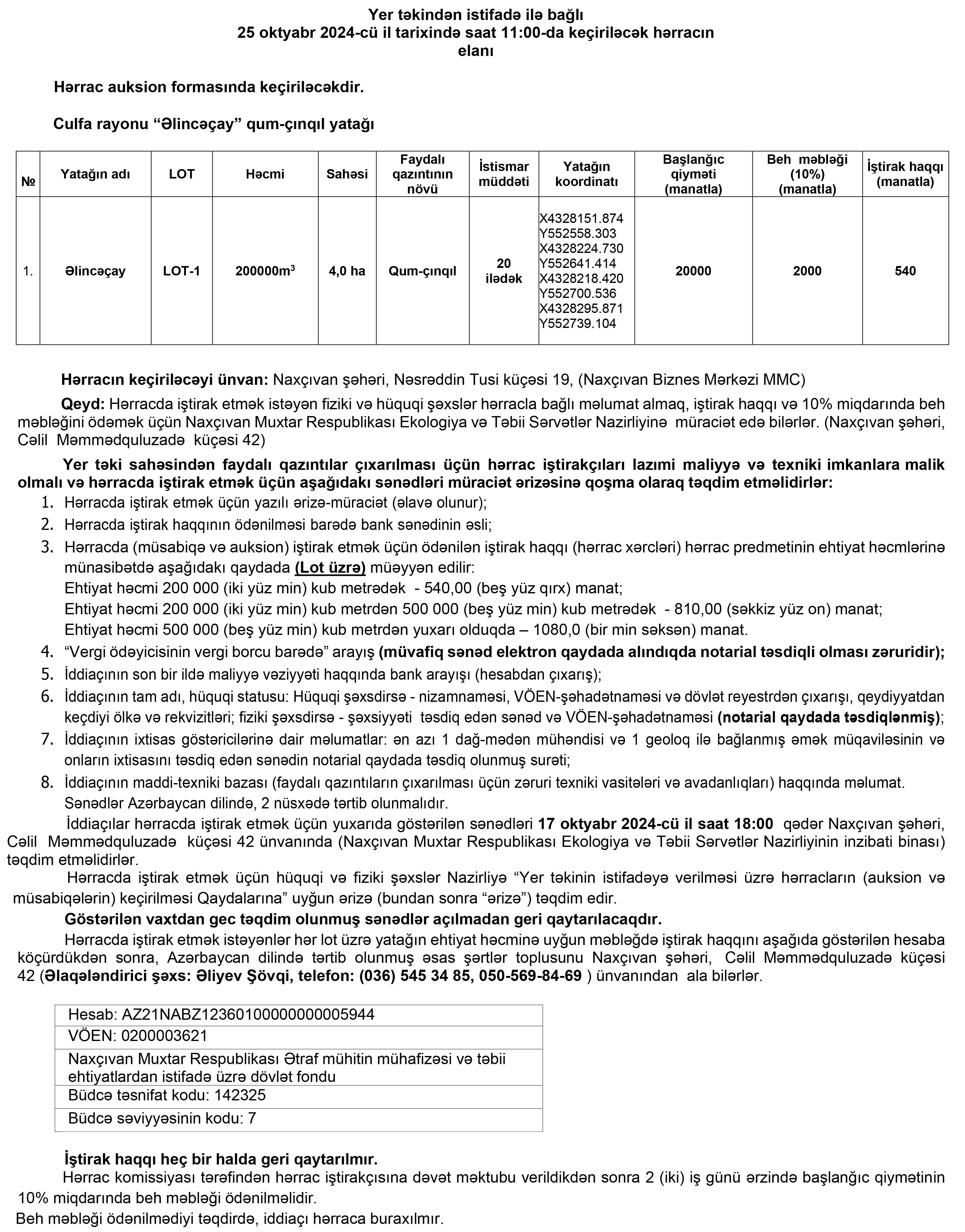 Naxçıvan Muxtar Respublikasının İqtisadiyyat Nazirliyi yanında Əmlak Məsələləri Dövlət Xidmətinin tabeliyində “Hərracların Təşkili Mərkəzi” publik hüquqi şəxs tərəfindən 25 oktyabr 2024-cü il tarixində keçiriləcək hərrac haqqında məlumat