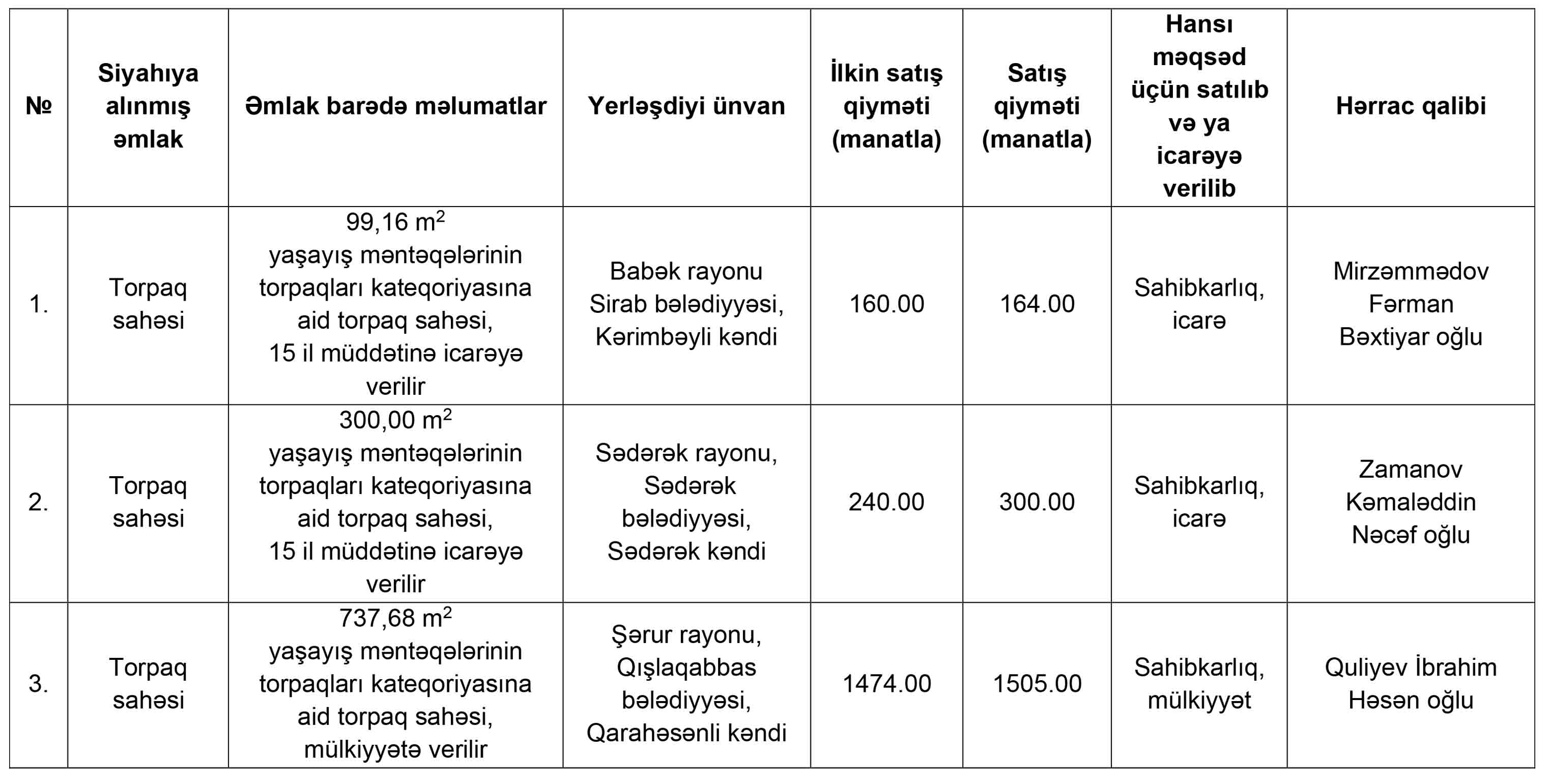 Naxçıvan Muxtar Respublikasının İqtisadiyyat Nazirliyi yanında Əmlak Məsələləri Dövlət Xidmətinin tabeliyində “Hərracların Təşkili Mərkəzi” publik hüquqi şəxs tərəfindən 27 fevral 2026-cı il tarixdə keçirilmiş torpaq hərraclarının nəticələri haqqında məlumat