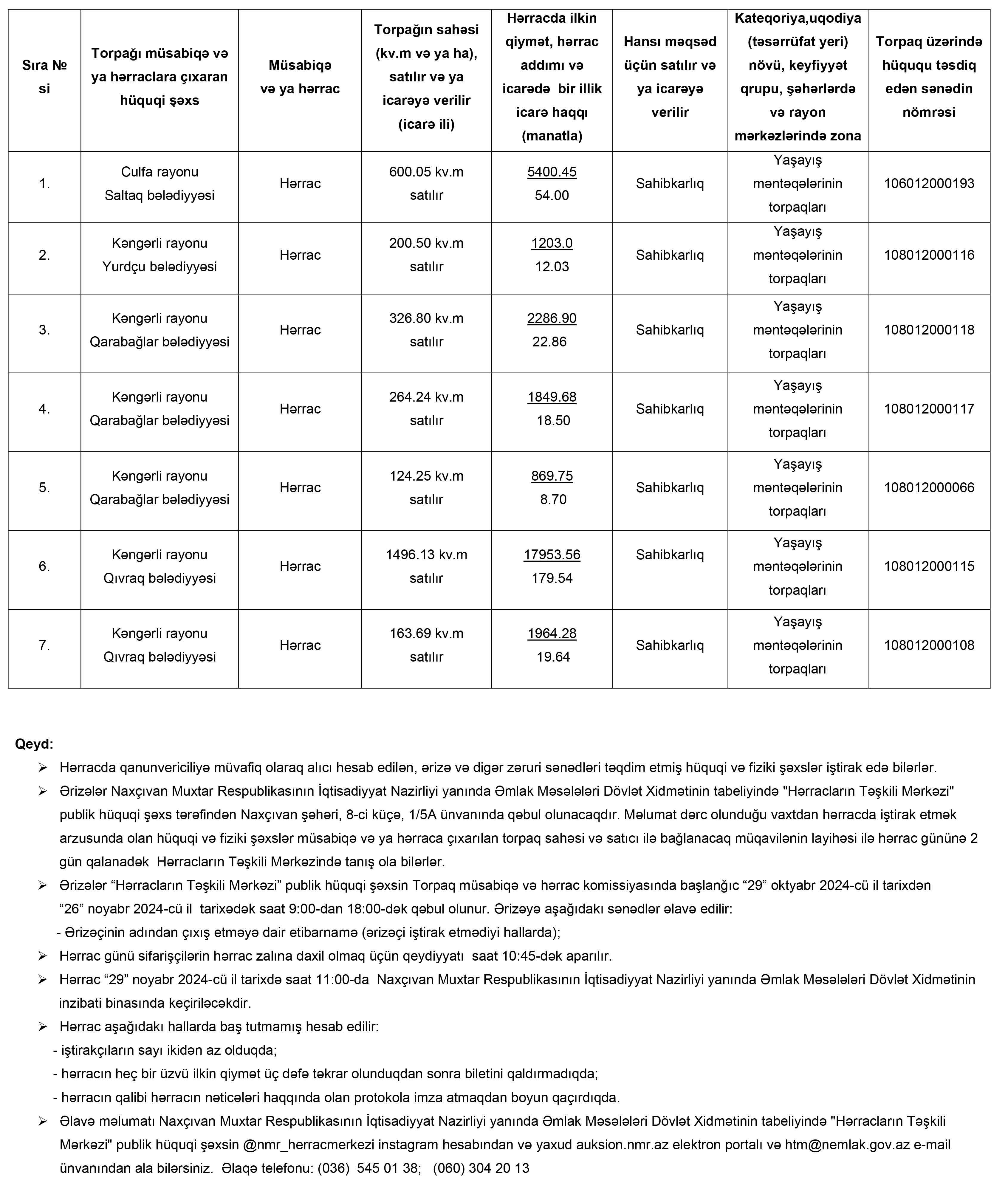 Naxçıvan Muxtar Respublikasının İqtisadiyyat Nazirliyi yanında Əmlak Məsələləri Dövlət Xidmətinin tabeliyində “Hərracların Təşkili Mərkəzi” publik hüquqi şəxs tərəfindən 29 noyabr 2024-cü il tarixdə keçiriləcək torpaq hərracları haqqında məlumat