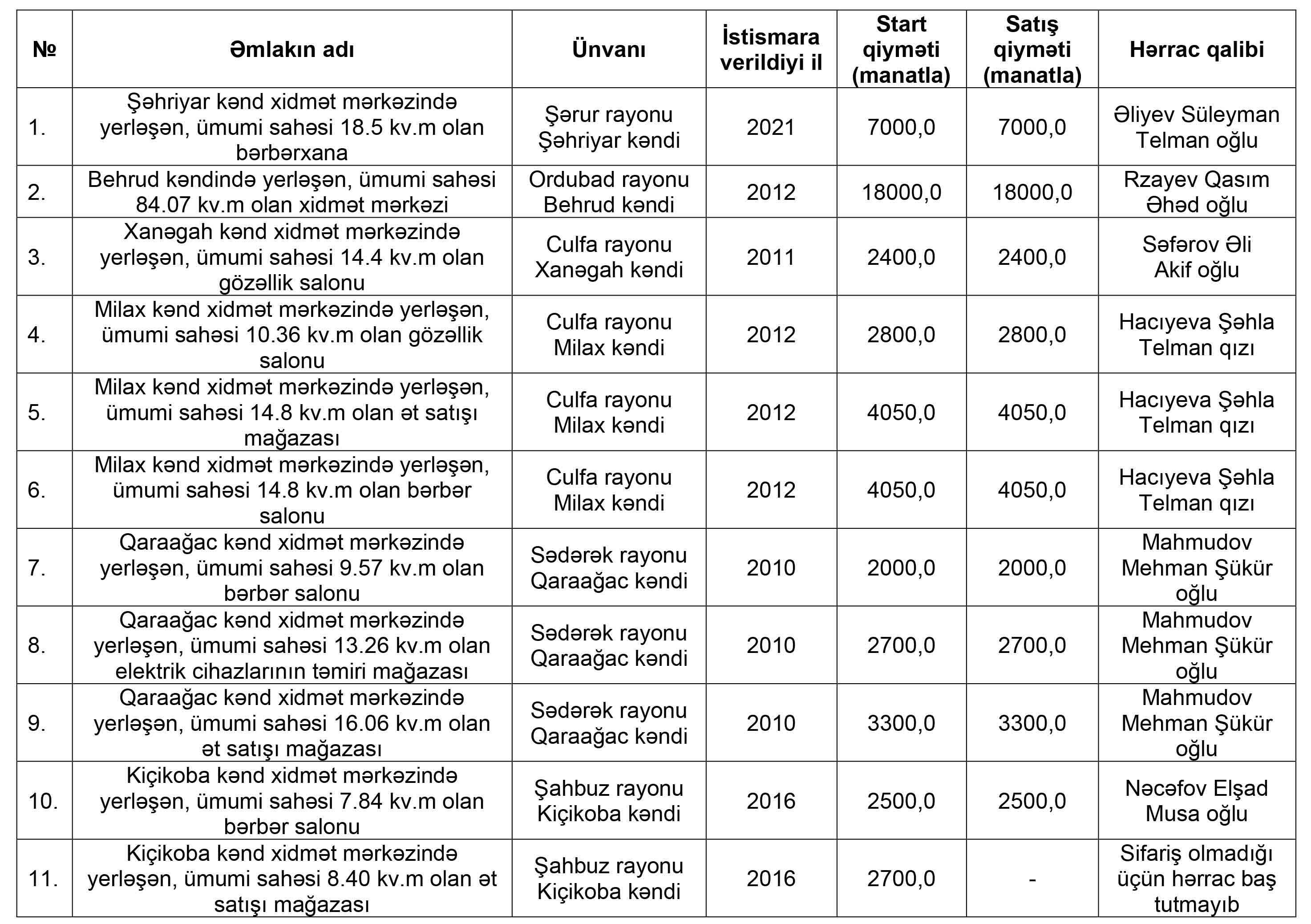 Naxçıvan Muxtar Respublikasının İqtisadiyyat Nazirliyi yanında Əmlak Məsələləri Dövlət Xidmətinin tabeliyində “Hərracların Təşkili Mərkəzi” publik hüquqi şəxs tərəfindən 29 oktyabr 2024-cü il tarixdə keçirilmiş qeyri-yaşayış sahələrinin nəticələri