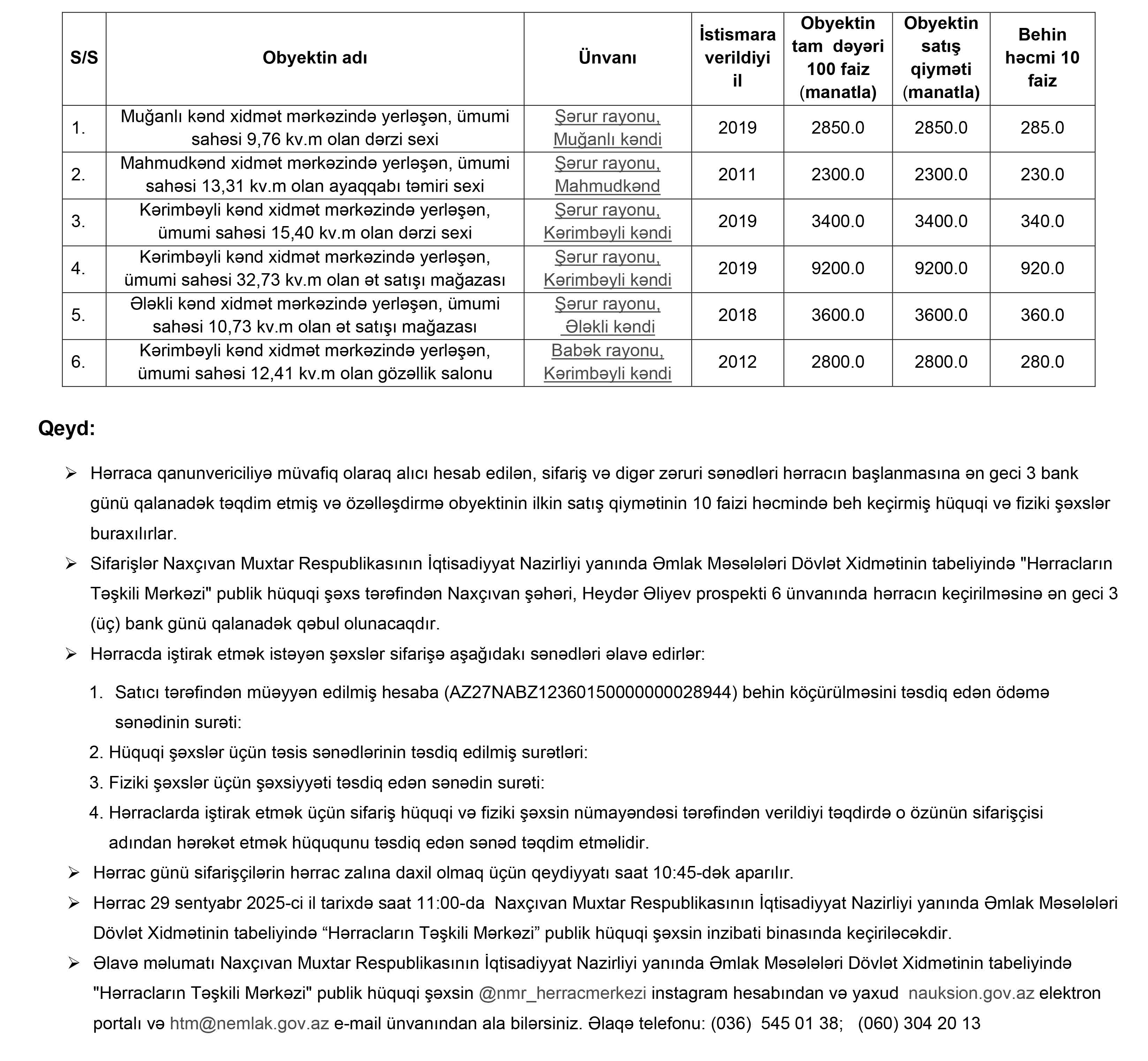 Naxçıvan Muxtar Respublikasının İqtisadiyyat Nazirliyi yanında Əmlak Məsələləri Dövlət Xidmətinin tabeliyində “Hərracların Təşkili Mərkəzi” publik hüquqi şəxs tərəfindən 29 sentyabr 2025-ci il tarixdə ikinci hərraca çıxarılacaq qeyri-yaşayış sahələri barədə məlumat