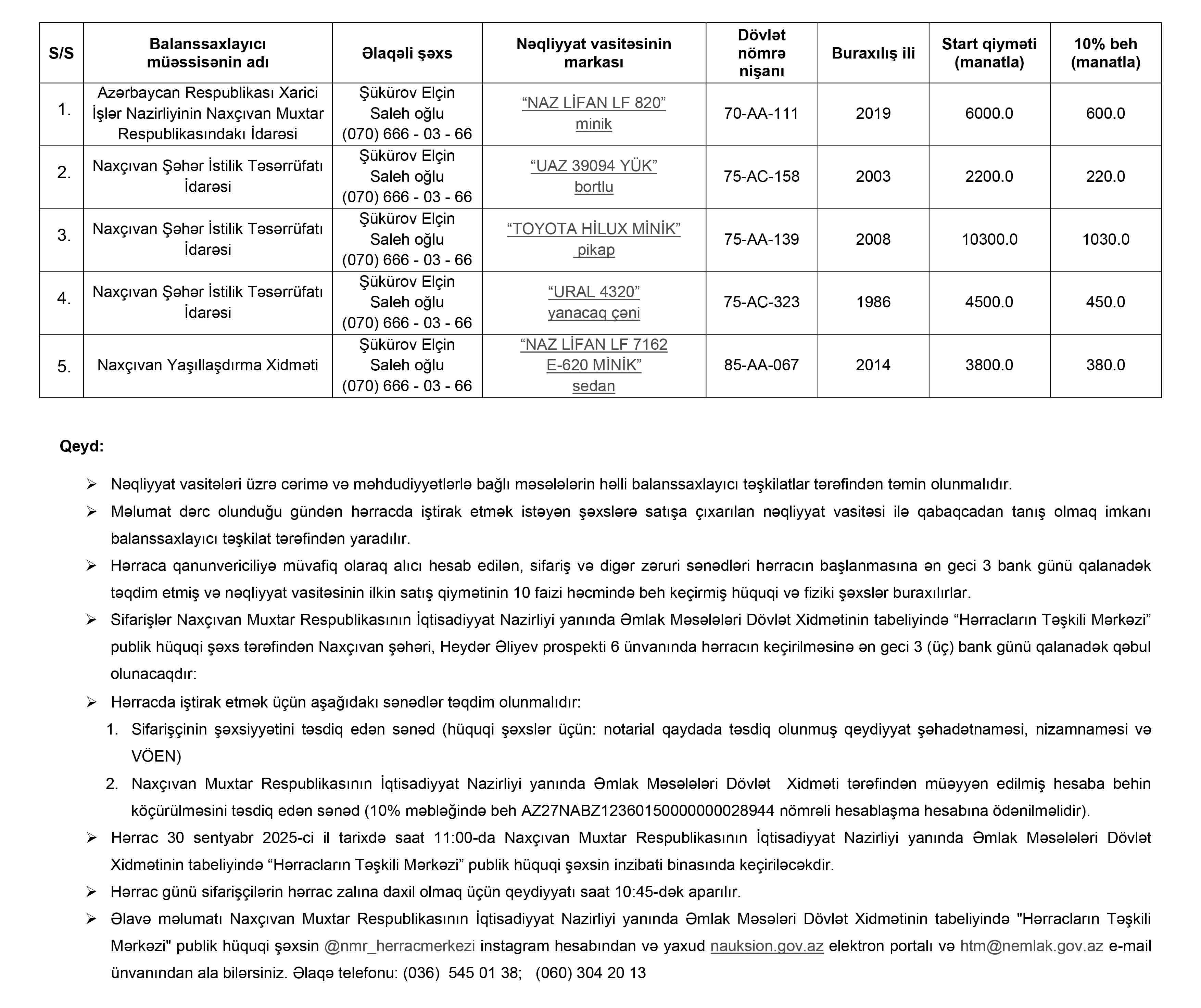 Naxçıvan Muxtar Respublikasının İqtisadiyyat Nazirliyi yanında Əmlak Məsələləri Dövlət Xidmətinin tabeliyində “Hərracların Təşkili Mərkəzi” publik hüquqi şəxs tərəfindən 30 sentyabr 2025-ci il tarixdə hərraca çıxarılacaq nəqliyyat vasitələrinin siyahısı