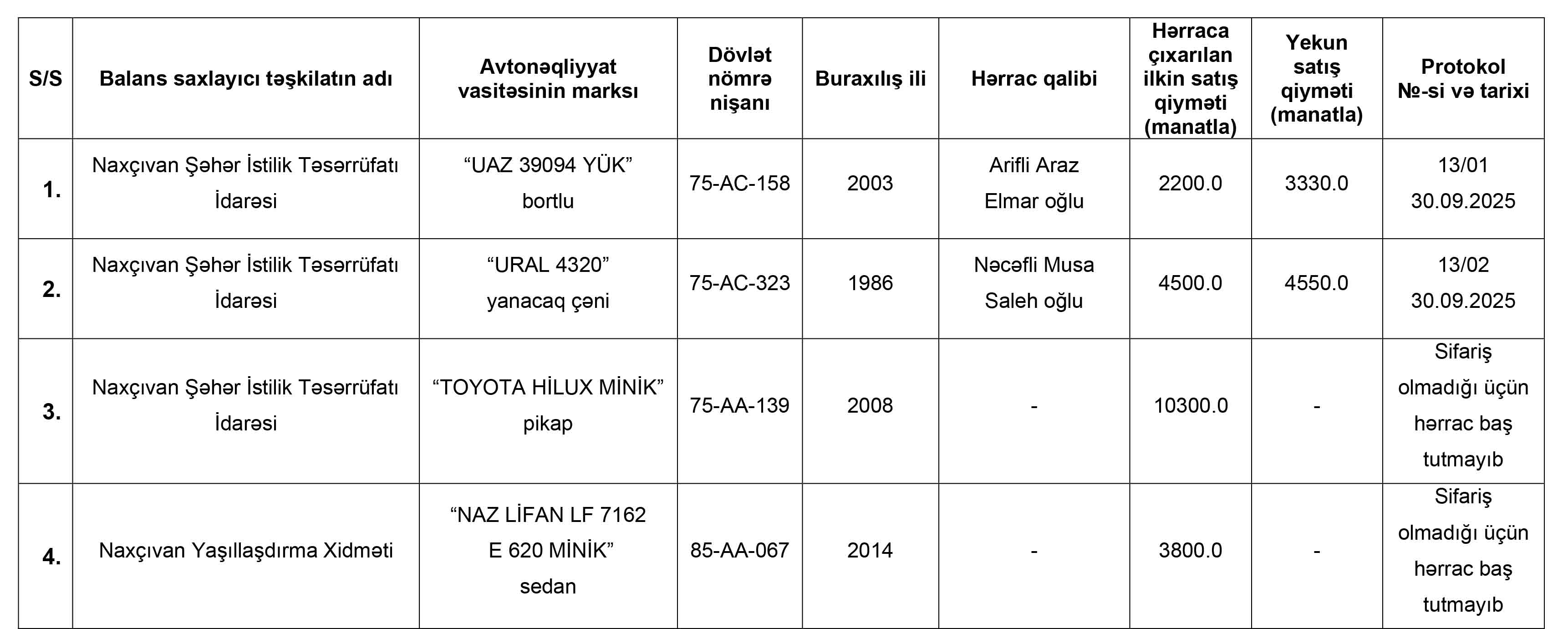 Naxçıvan Muxtar Respublikasının İqtisadiyyat Nazirliyi yanında Əmlak Məsələləri Dövlət Xidmətinin tabeliyində “Hərracların Təşkili Mərkəzi” publik hüquqi şəxs tərəfindən 30 sentyabr 2025-ci il tarixdə hərracda satılmış nəqliyyat vasitələrinin siyahısı