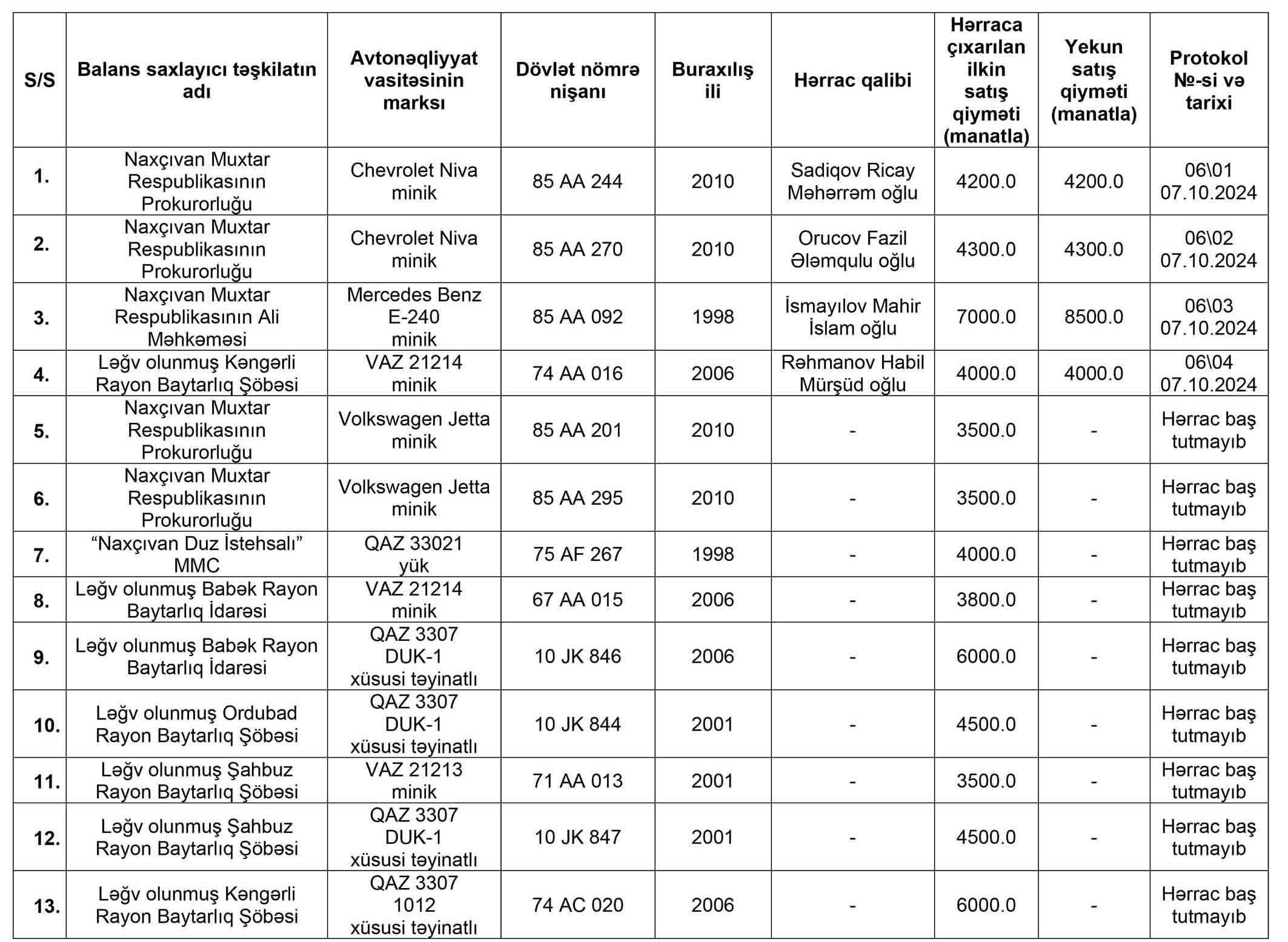 Naxçıvan Muxtar Respublikasının İqtisadiyyat Nazirliyi yanında Əmlak Məsələləri Dövlət Xidmətinin tabeliyində “Hərracların Təşkili Mərkəzi” publik hüquqi şəxs tərəfindən 7 oktyabr 2024-cü il tarixdə hərracda satılmış nəqliyyat vasitələrinin siyahısı