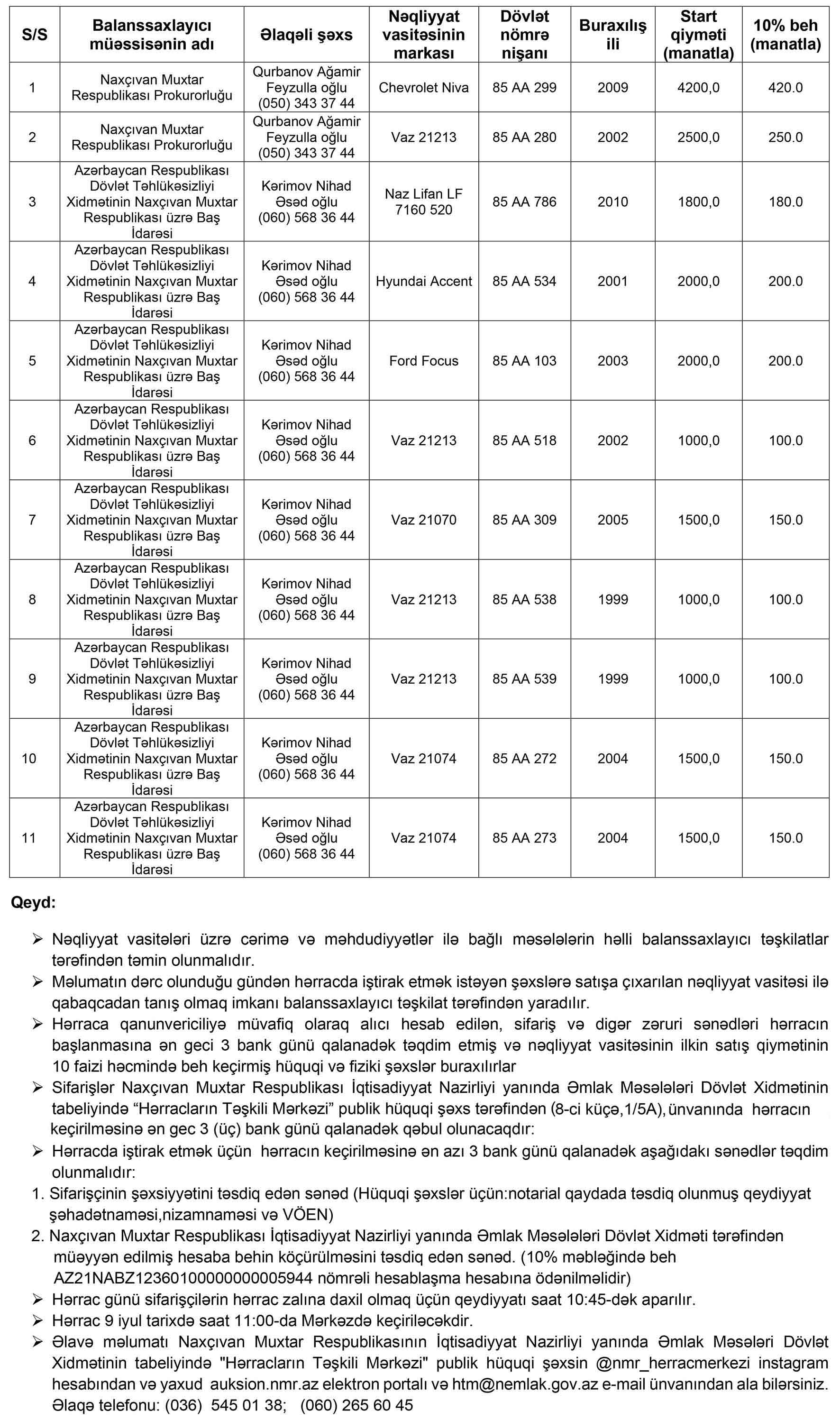 Naxçıvan Muxtar Respublikasının İqtisadiyyat Nazirliyi yanında Əmlak Məsələləri Dövlət Xidmətinin tabeliyində “Hərracların Təşkili Mərkəzi” publik hüquqi şəxs tərəfindən 9 iyul 2024-cü il tarixdə hərraca çıxarılacaq nəqliyyat vasitələrinin siyahısı