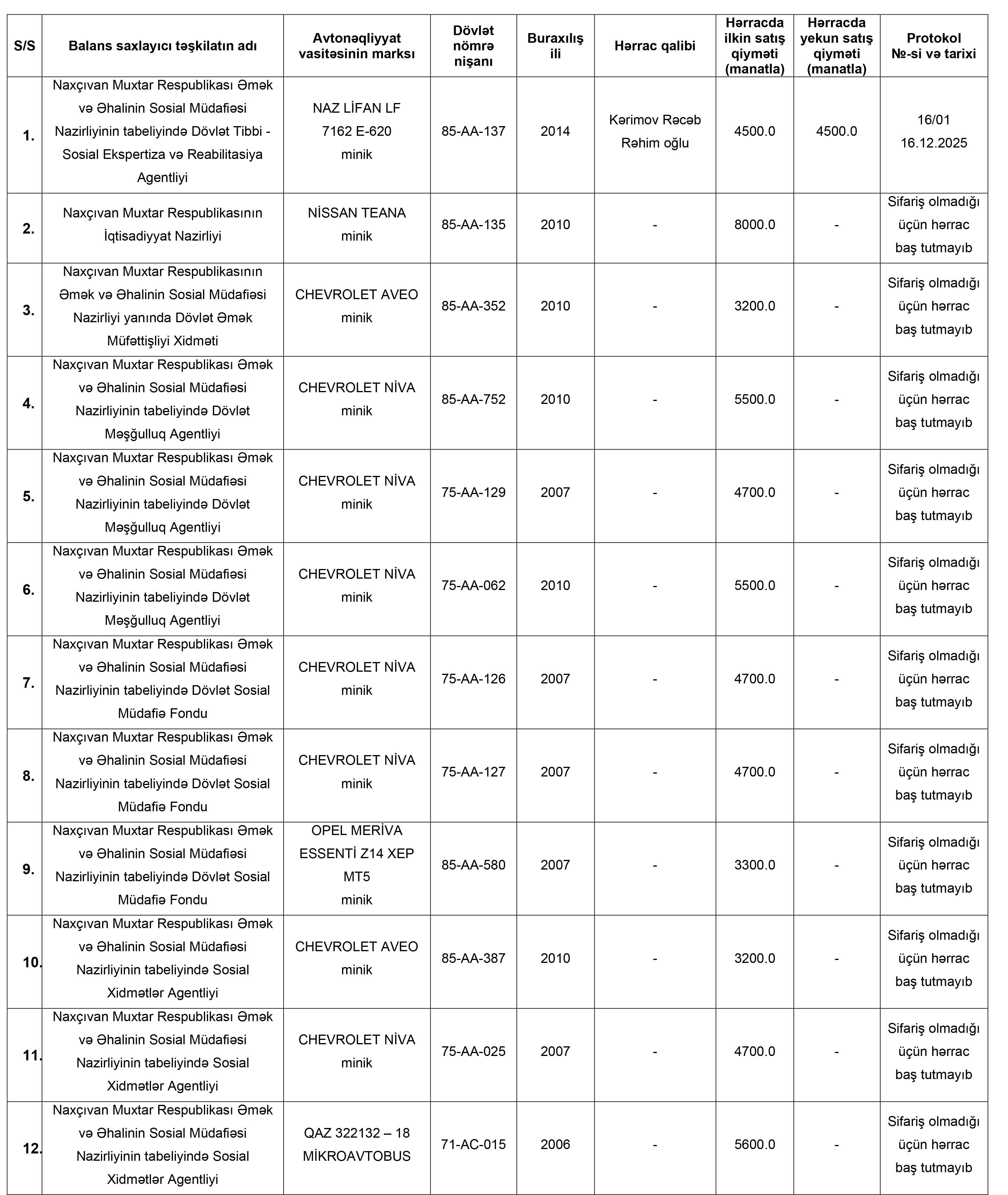 Naxçıvan Muxtar Respublikasının İqtisadiyyat Nazirliyi yanında Əmlak Məsələləri Dövlət Xidmətinin tabeliyində “Hərracların Təşkili Mərkəzi” publik hüquqi şəxs tərəfindən nəqliyyat vasitələrinin satışı ilə bağlı 16 dekabr 2025-ci il tarixdə keçirilmiş hərracın nəticələri haqqında məlumat