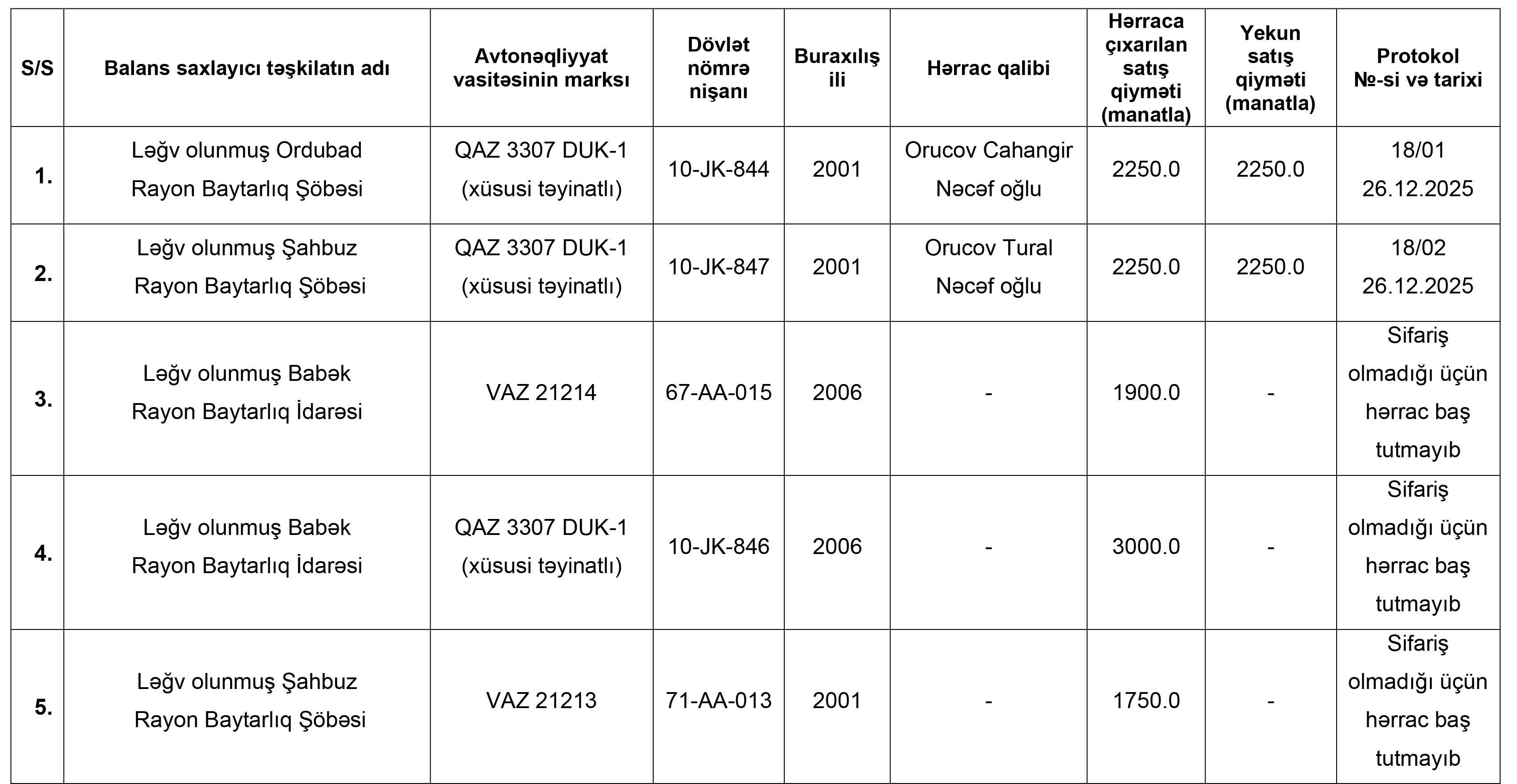 Naxçıvan Muxtar Respublikasının İqtisadiyyat Nazirliyi yanında Əmlak Məsələləri Dövlət Xidmətinin tabeliyində “Hərracların Təşkili Mərkəzi” publik hüquqi şəxs tərəfindən nəqliyyat vasitələrinin satışı ilə bağlı 26 dekabr 2025-ci il tarixdə keçirilmiş hərracın nəticələri haqqında məlumat