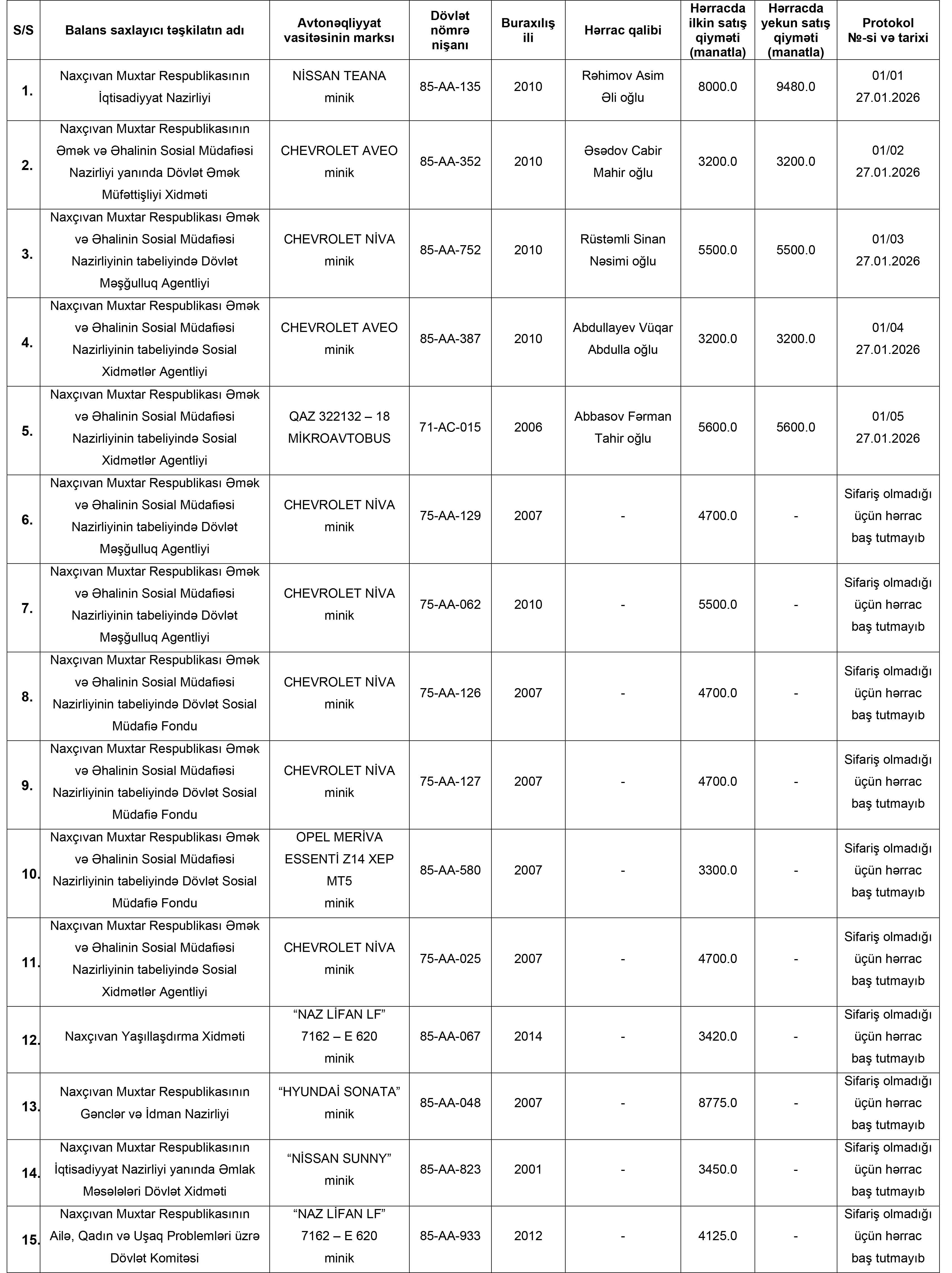 Naxçıvan Muxtar Respublikasının İqtisadiyyat Nazirliyi yanında Əmlak Məsələləri Dövlət Xidmətinin tabeliyində “Hərracların Təşkili Mərkəzi” publik hüquqi şəxs tərəfindən nəqliyyat vasitələrinin satışı ilə bağlı 27 yanvar 2026-cı il tarixdə keçirilmiş hərracın nəticələri haqqında məlumat