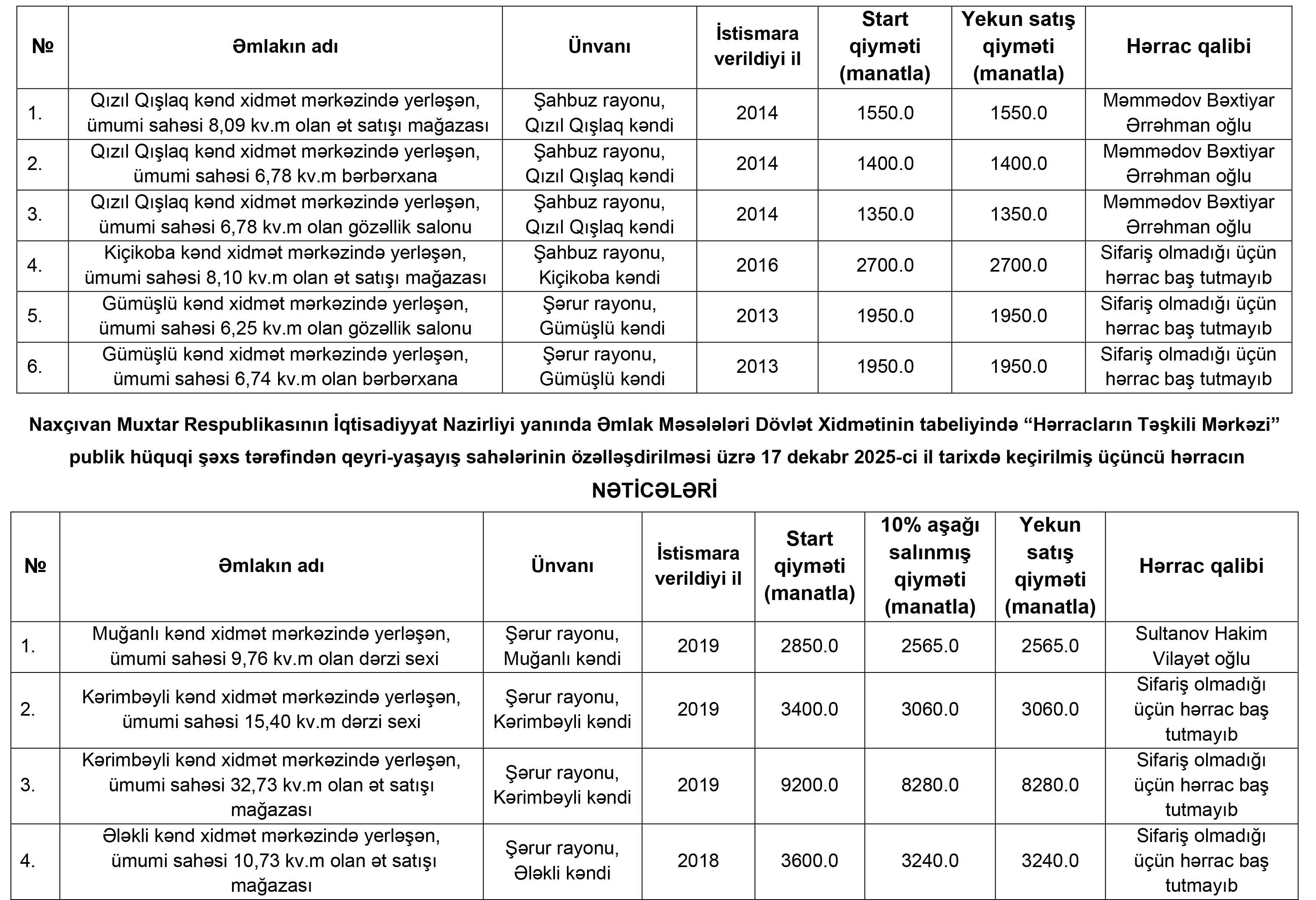 publik hüquqi şəxs tərəfindən qeyri-yaşayış sahələrinin özəlləşdirilməsi üzrə 17 dekabr 2025-ci il tarixdə keçirilmiş ikinci hərracın nəticələri